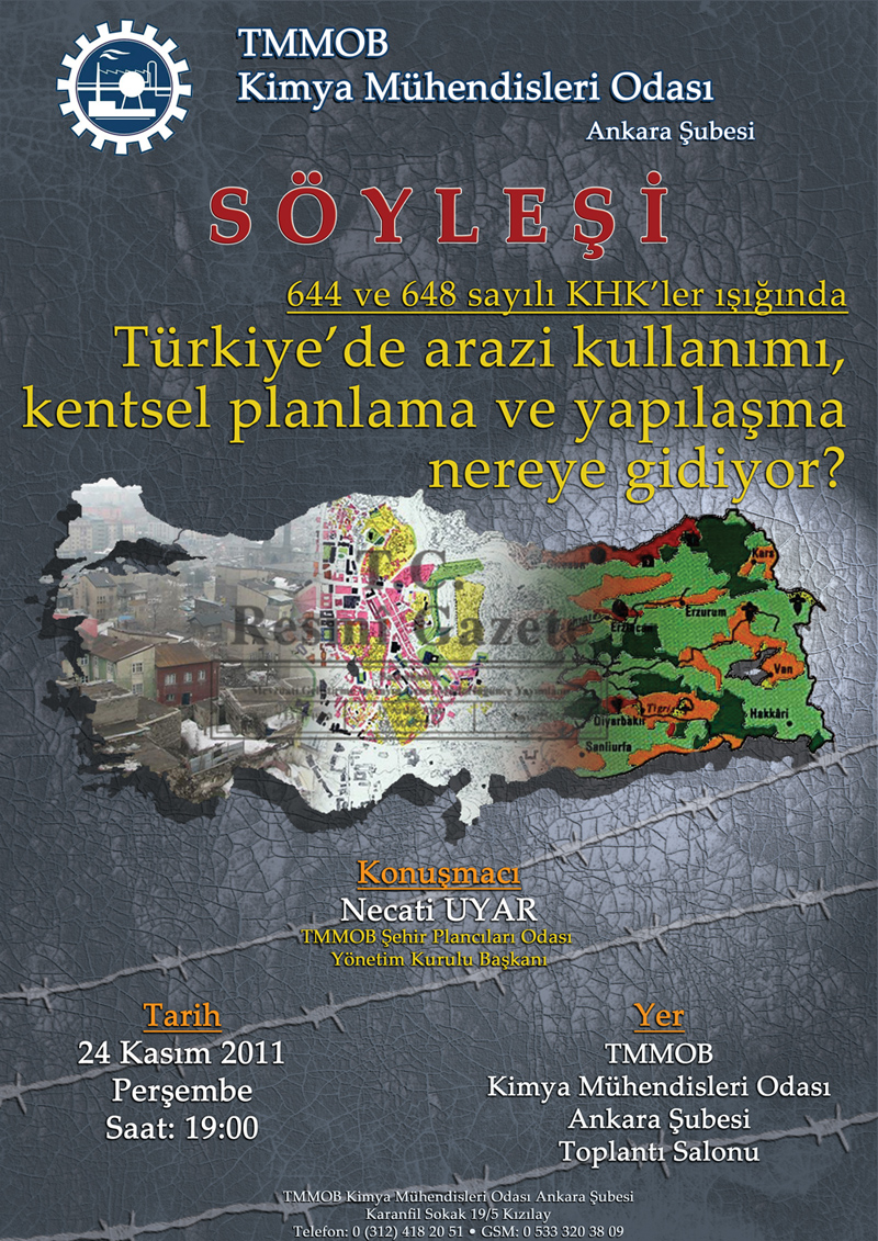 "644 ve 648 sayılı KHK`ler ışığında Türkiye`de arazi kullanımı, kentsel planlama ve yapılaşma nereye gidiyor?" konulu söyleşi 24 Kasım 2011 Perşembe günü saat 19:00‘ da TMMOB Kimya Mühendisleri Odası Ankara Şubesi Toplantı salonunda gerçekleştirildi.