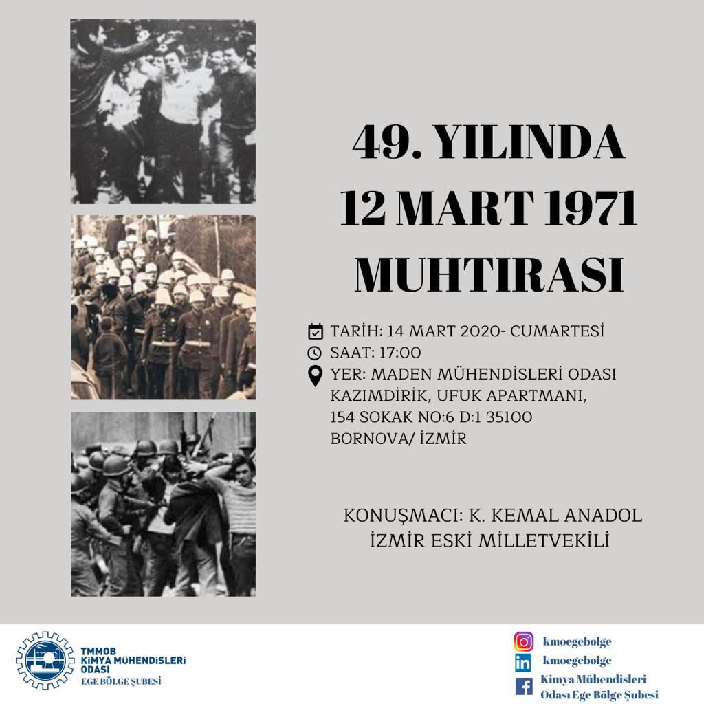 14 Mart 2020 Cumartesi günü saat: 17.00 de İzmir eski Milletvekili Sn. K. Kemal ANADOL‘un sunacağı "49. YILINDA 12 MART 1971 MUHTIRASI " konulu Söyleşi düzenlenecektir.