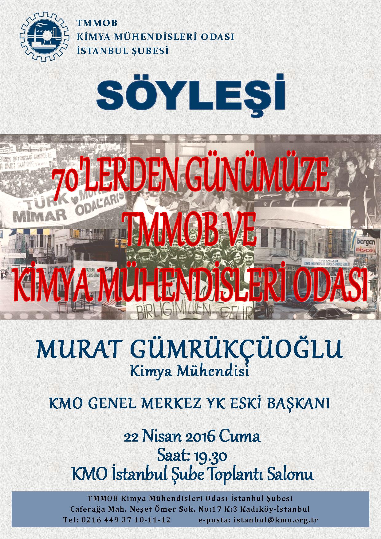 22 Nisan 2016 Cuma günü şubemizde `70lerden Günümüze TMMOB ve Kimya Mühendisleri Odası` konulu söyleşi gerçekleşecektir.