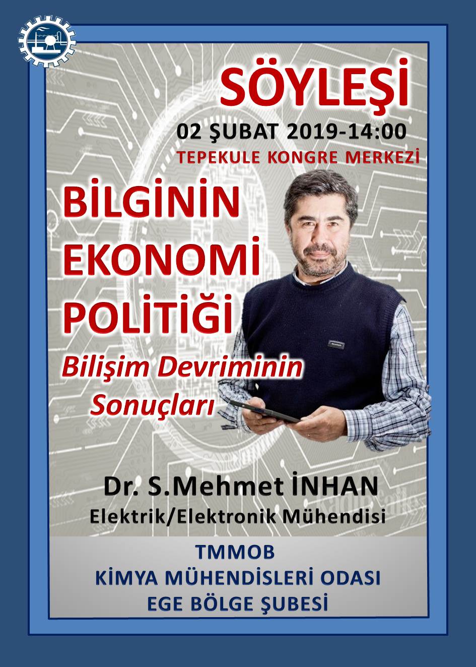 TMMOB Kimya Mühendisleri Odası Ege Bölge Şubesi olarak 2 Aralık 2019 Cumartesi günü saat:14.00 da Dr. S. Mehmet İNHAN‘ın sunacağı "Bilginin Ekonomi Politiği, Bilişim Devriminin Sonuçları" konulu Söyleşiyi düzenleyeceğiz.