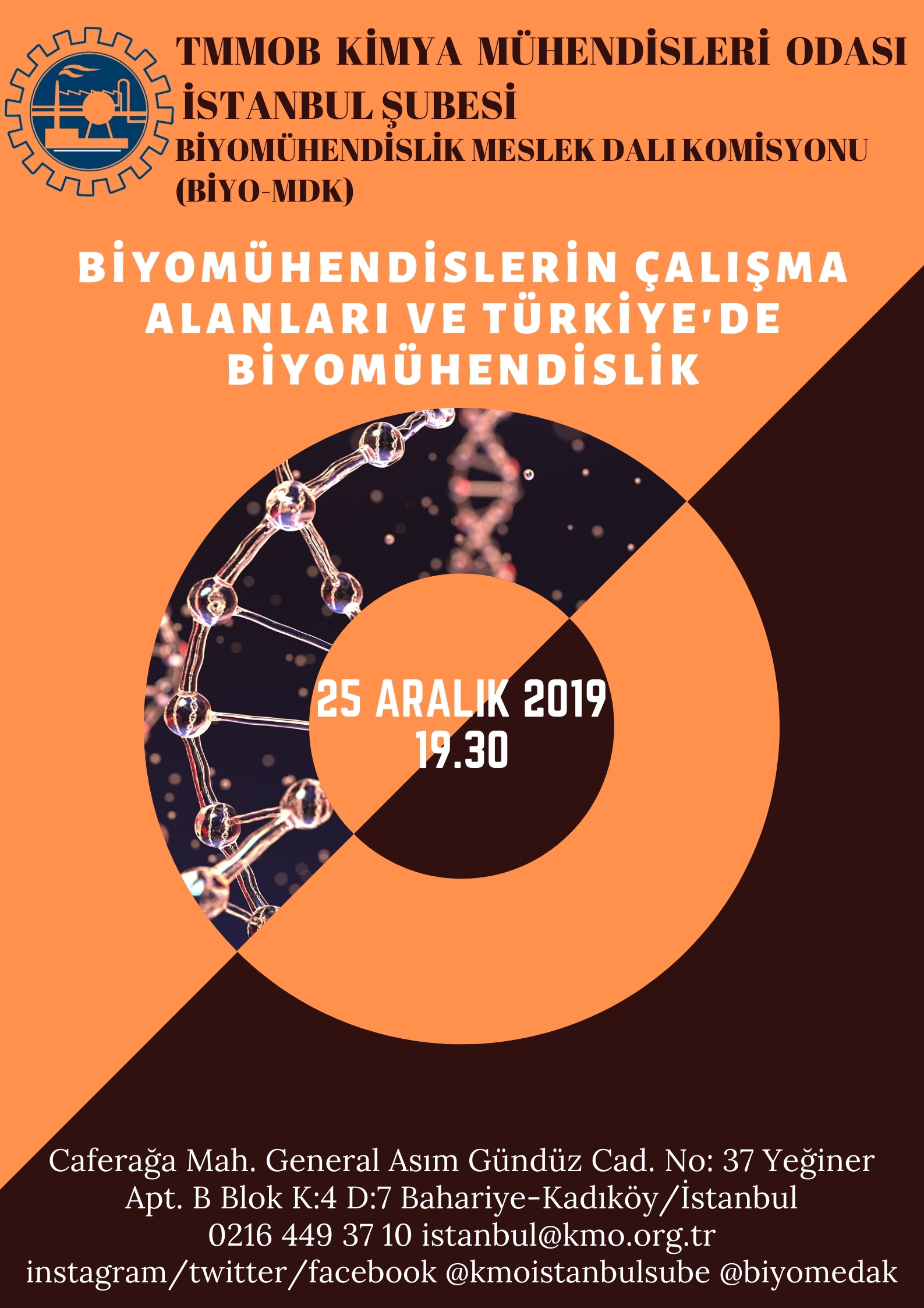 25 Aralık 2019 Çarşamba akşamı şubemiz Biyomühendislik Meslek Dalı Komisyonu (Biyo-MDK) tarafından şubemiz eğitim ve toplantı salonunda "Biyomühendislerin Çalışma Alanları ve Türkiye'de Biyomühendislik" başlıklı söyleşi gerçekleşecektir.