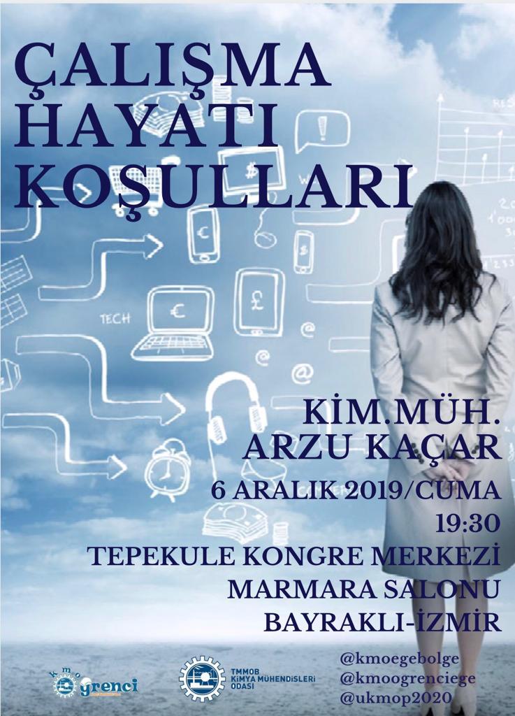 06 Aralık 2019 Cuma günü saat: 19.30 da, Kimya Mühendisi Arzu KAÇAR ‘ın İşsiz, yeni mezun ve öğrenci üyelerimize yönelik sunacağı "Çalışma Hayatı koşulları" konulu Söyleşisi gerçekleşecektir.