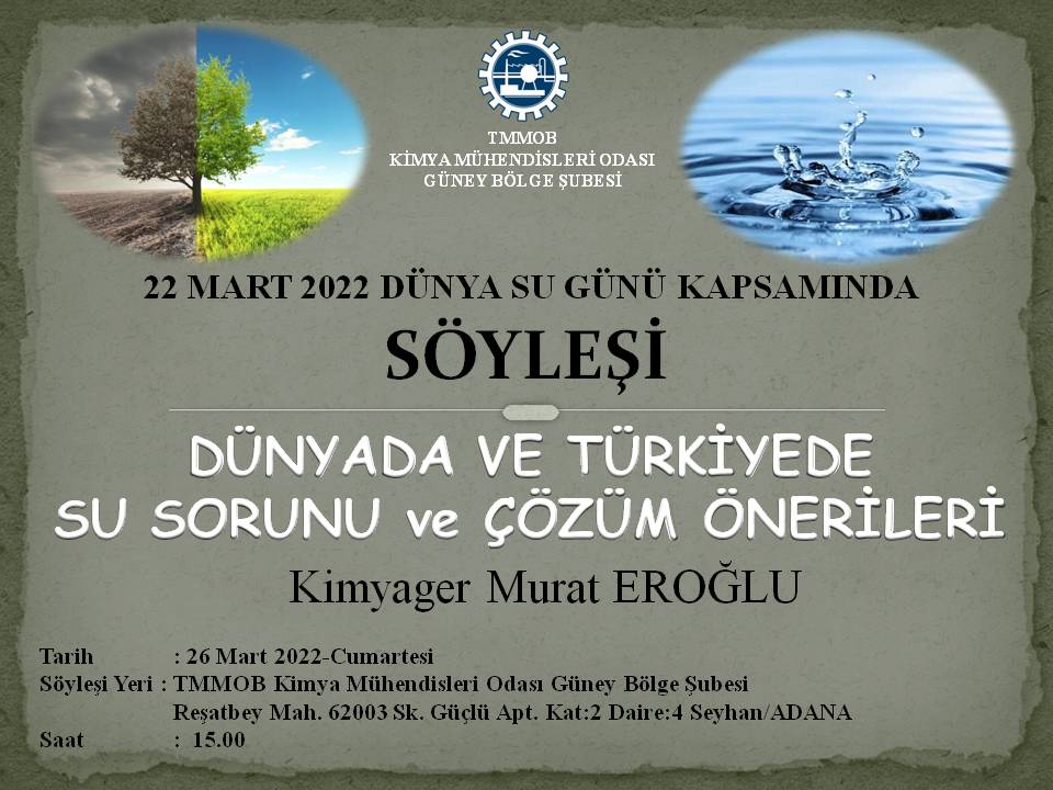 22 Mart Dünya Su Günü kapsamında Kimyager Murat EROĞLUnun sunumuyla "Dünyada ve Türkiyede Su Sorunu ve Çözüm Önerileri" hakkında söyleşi düzenlenecektir.