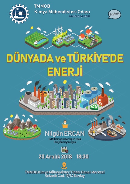 20 Aralık 2018 Perşembe günü saat 18:30'da Oda Merkezimizde (Selanik Cad. 17/14 Çamlı Apt. Kat:5 Kızılay) konuşmacı olarak; Kimya Mühendisleri Odası Enerji Komisyonu Üyesi Sayın Nilgün ERCAN'ın katılacağı "Dünyada ve Türkiye'de Enerji" söyleşisi düzenlenecektir. Söyleşiye tüm üyelerimiz davetlidir.