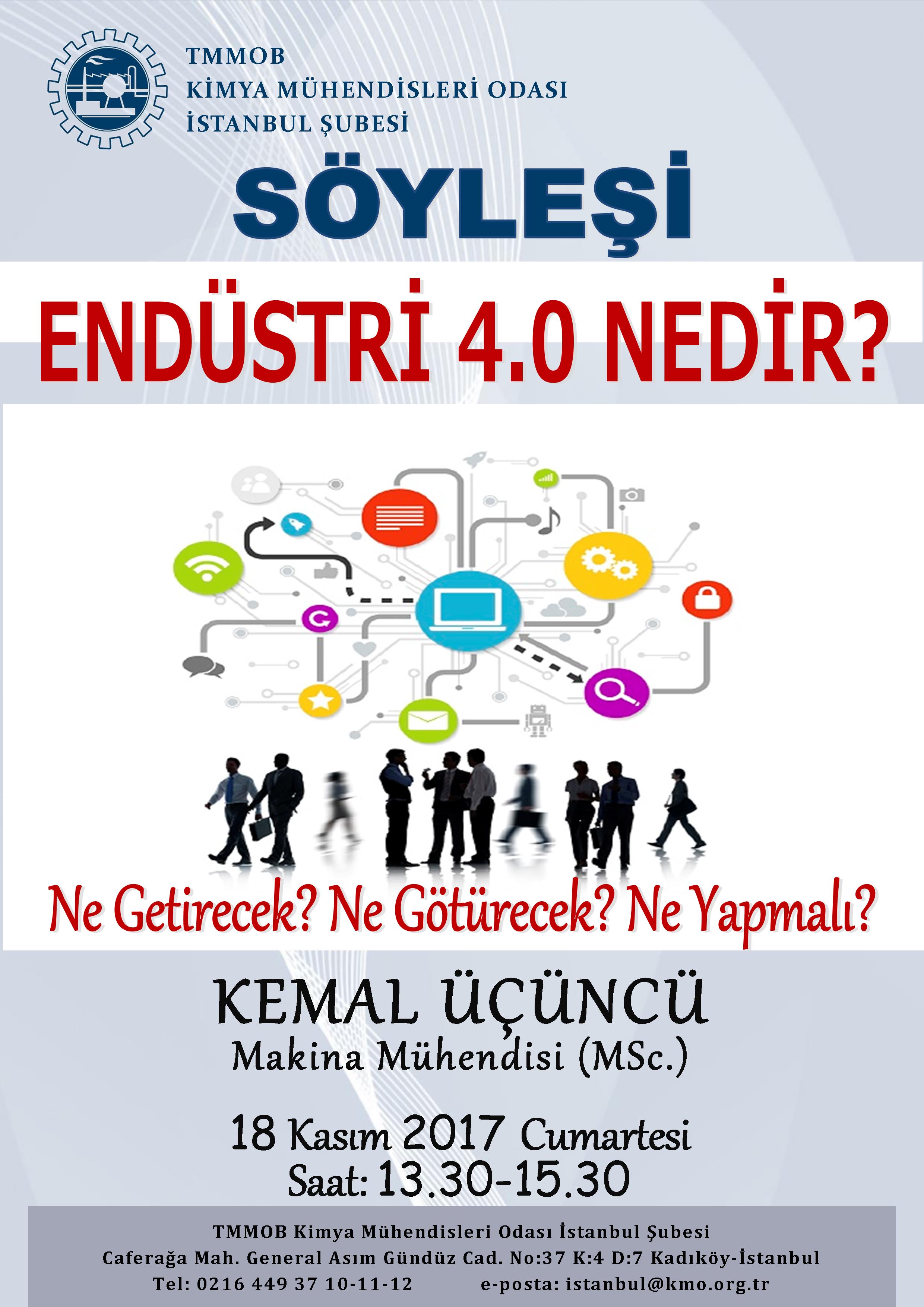 18 Kasım Cumartesi günü Şubemiz tarafından "Endüstri 4.0 Nedir? (Ne Getirecek? Ne Götürecek? Ne Yapmalı? " konulu söyleşi gerçekleşecektir. Söyleşimiz, Sayın Makina Mühendisi Kemal Üçüncü`nün sunumuyla gerçekleşecek olup, herkesin katılımına açıktır. Etkinlik şubemizin yeni adresi olan Caferağa Mah. General Asım Gündüz Cad. No:37 Yeğiner Apt. B Blok D:7 K:4 Kadıköy adresinde gerçekleşecektir.