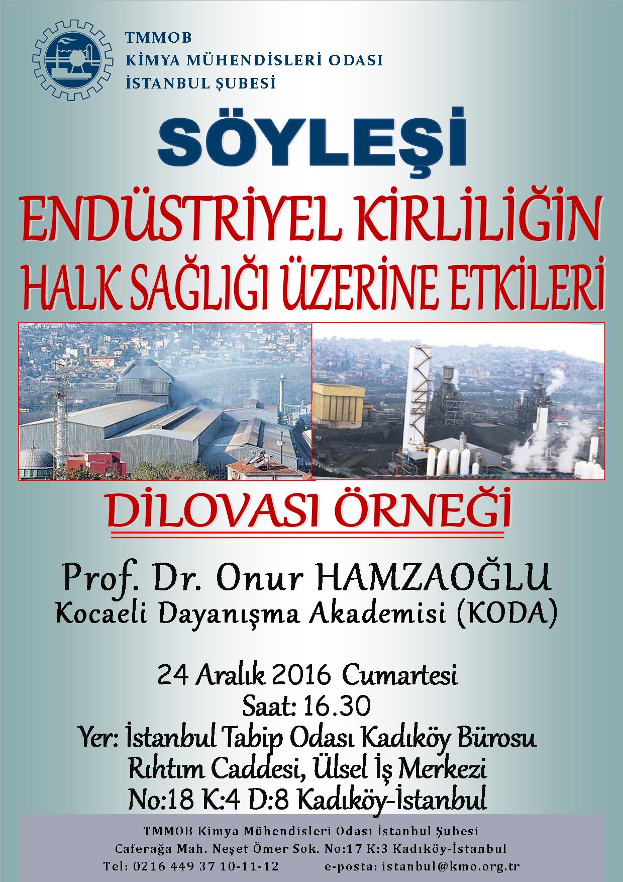 24 Aralık 2016 Cumartesi günü Şubemiz tarafından `Endüstriyel Kirliliğin Halk Sağlığı Üzerine Etkileri: Dilovası Örneği` konulu söyleşi gerçekleşecektir.