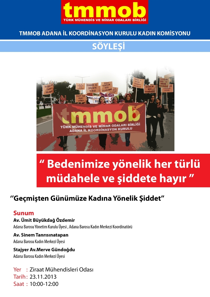 TMMOB Adana İl Koordinasyon Kurulu Kadın Komisyonu, tarafından 23.11.2013 Saat 10:00`da Ziraat Mühendisleri Odası Adana Şubesinde `Geçmişten Günümüze Kadına Yönelik Şiddet` konulu Söyleşi düzenlenecektir.