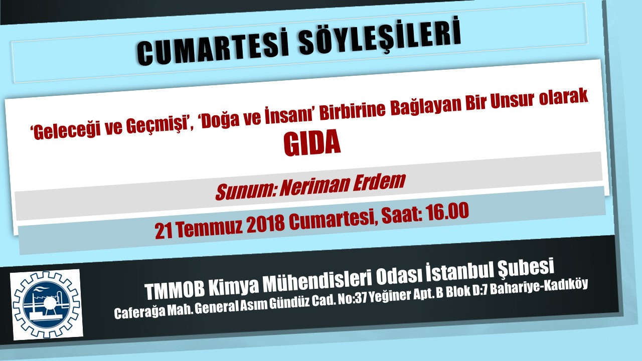 21 Temmuz 2018 Cumartesi günü şubemizde "Geleceği ve Geçmişi, Doğa ve İnsanı Birbirine Bağlayan Bir Unsur Olarak Gıda" konulu söyleşi gerçekleşecektir.