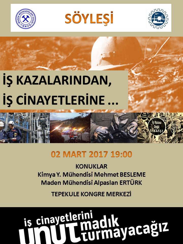 3 Mart İş Cinayetleri ile Mücadele Günü nedeniyle TMMOB Kimya Mühendisleri Odası Ege Bölge Şubesi olarak TMMOB Maden Mühendisleri Odası İzmir Şubesi ile birlikte `İş Kazalarından, İş Cinayetlerine` konulu Söyleşiyi düzenleyeceğiz.