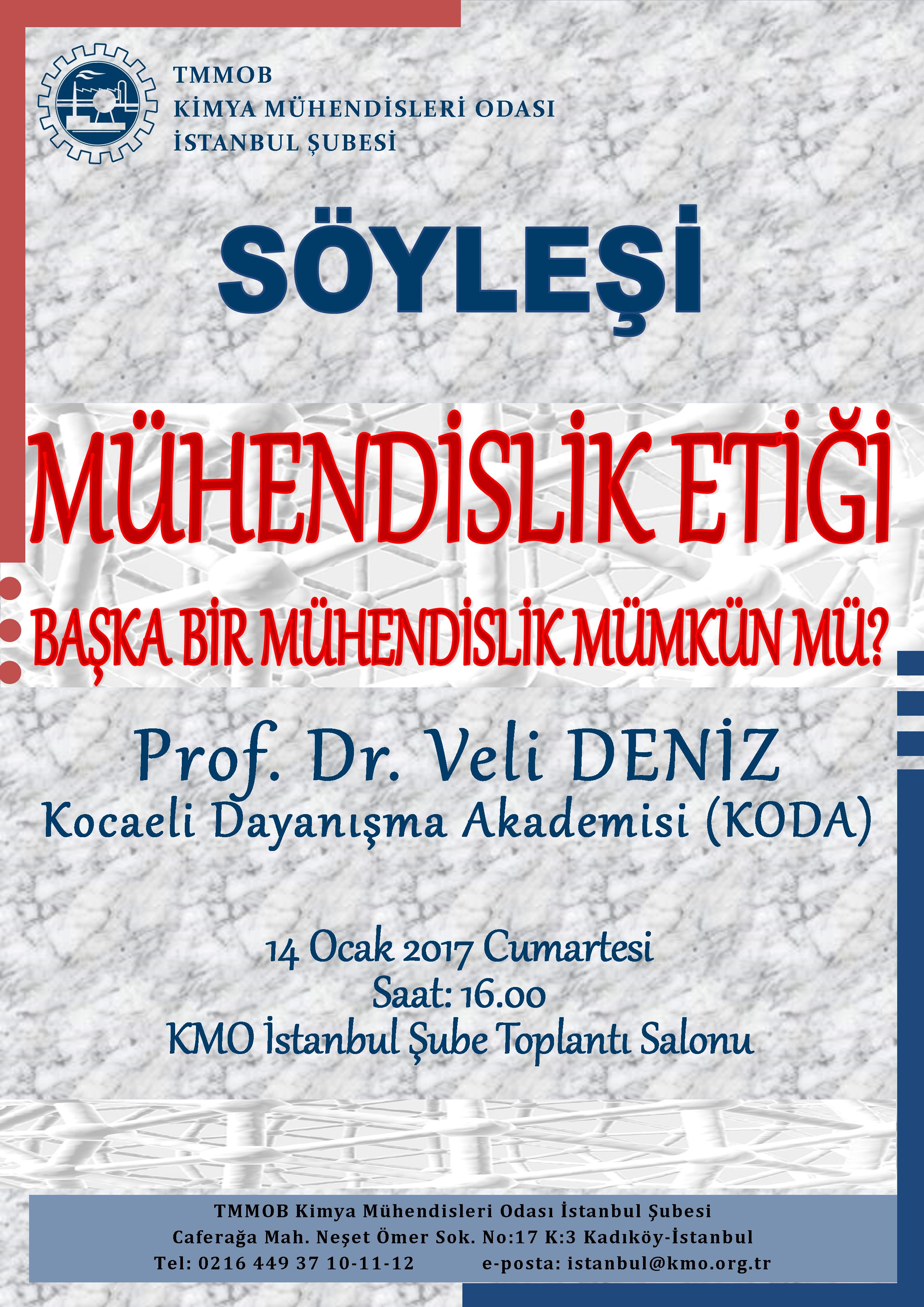 14 Ocak 2017 Cumartesi günü şubemizde "Mühendislik Etiği: Başka Bir Mühendislik Mümkün mü?" konulu söyleşi gerçekleşecektir. Söyleşimiz Prof. Dr. Veli Deniz`in katkılarıyla gerçekleşecek olup, herkesin katılımına açıktır.