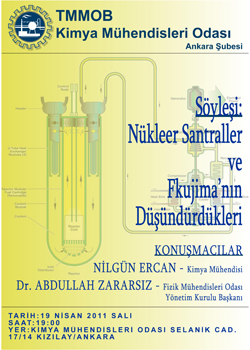 Odamız üyesi Nilgün ERCAN ve Fizik Mühendisleri Odası Yönetim Kurulu Başkanı Dr. Abdullah ZARARSIZın konuşmacı olarak katıldıkları "Nükleer Santraller ve Fkujimanın Düşündürdükleri" konulu söyleşimiz 19 Nisan 2011 Salı günü YÜCEL ÖZEL Toplantı Salonunda gerçekleştirilmiştir. Söyleşiye odamız üyeleri ve öğrenci üyeleri katılmıştır.