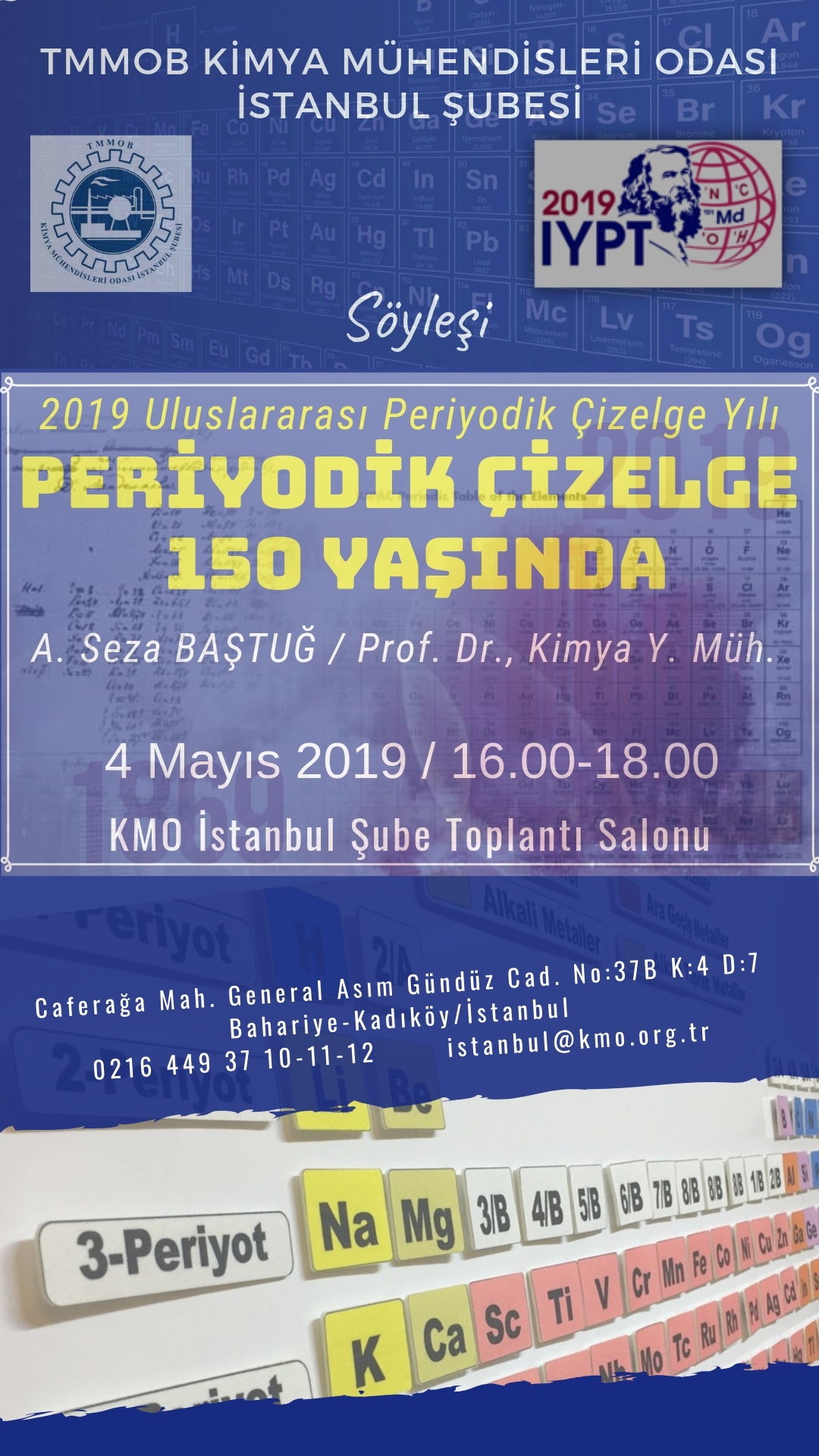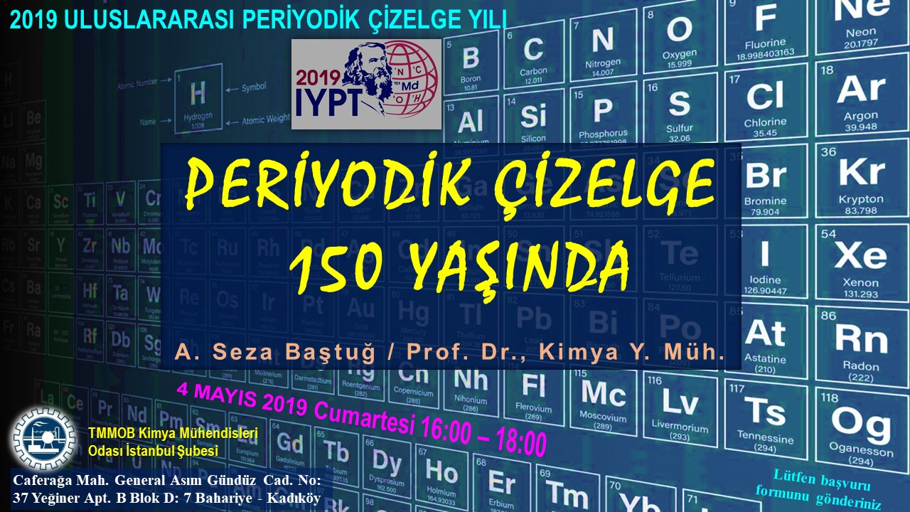 Bu bağlamda üyemiz Prof. Dr. A. Seza Baştuğ`un sunacağı "Periyodik Çizelge 150 Yaşında" başlıklı söyleşimize katılımınızı bekliyoruz.