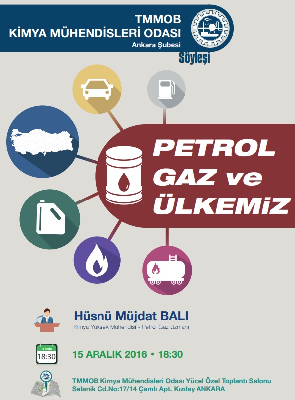 15 Aralık 2016 Perşembe günü saat 18:30`da Oda Merkezimizde (Selanik Cad. 17/14 Çamlı Apt. Kat:5 Kızılay) konuşmacı olarak Değerli üyemiz Kimya Yüksek Mühendisi Hüsnü Müjdat BALInın katılacağı Petrol,Gaz ve Ülkemiz` söyleşisi düzenlenecektir. Katılımınızı bekleriz.