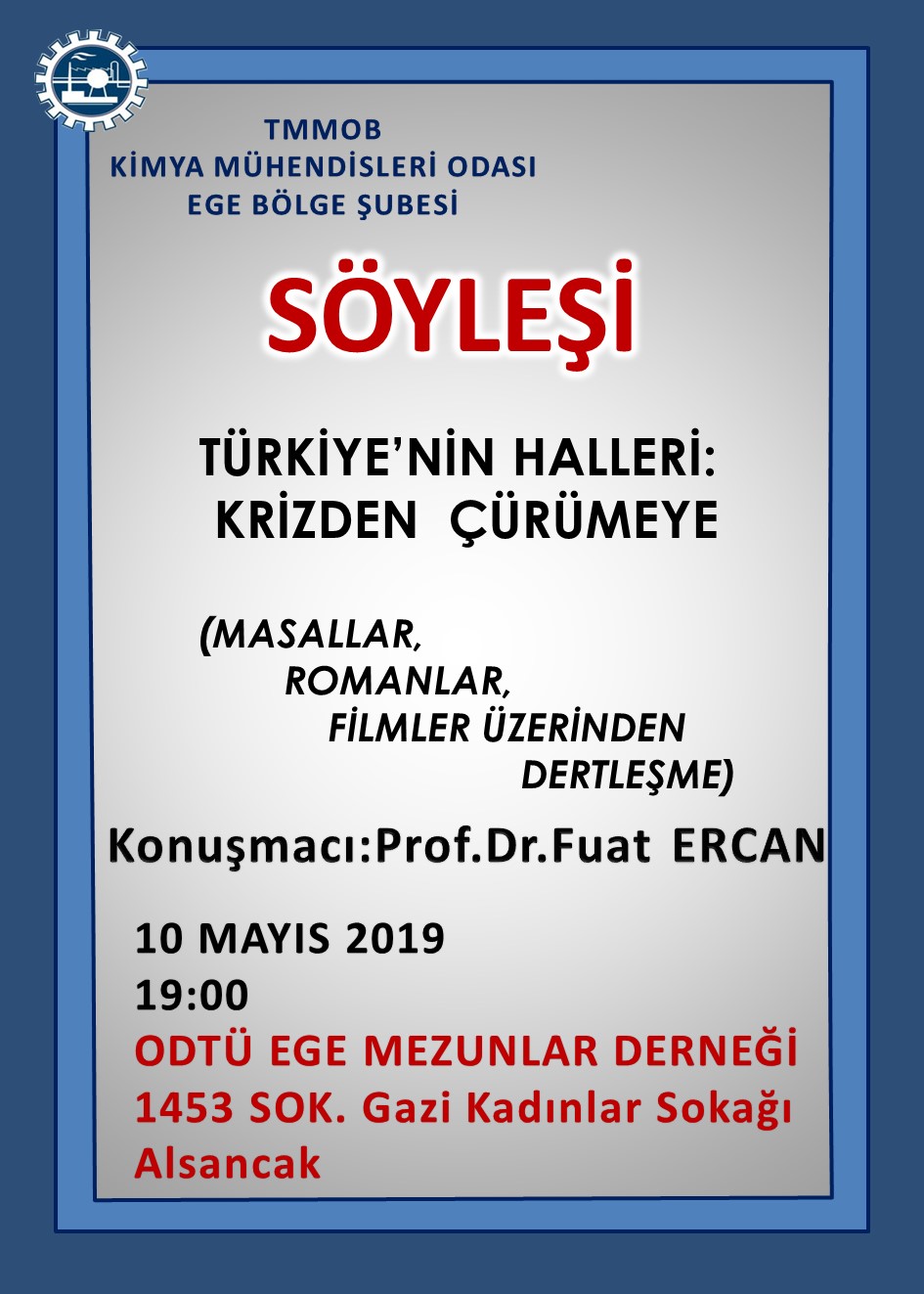 TMMOB Kimya Mühendisleri Odası Ege Bölge Şubesi olarak 10 Mayıs 2019 Cuma günü Saat: 19.00 da ODTÜ Ege Mezunlar Derneğinde Prof. Dr. Fuat ERCANın sunacağı "Türkiyenin Halleri:Krizden Çürümeye " konulu Söyleşi düzenlenecektir.