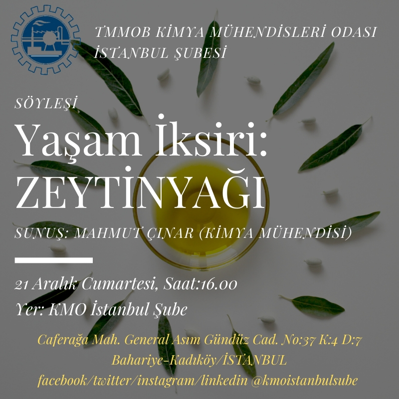21 Aralık 2019 Cumartesi günü şubemizde "Yaşam İksiri: Zeytinyağı" başlıklı söyleşi gerçekleşecektir. Söyleşimiz, Kimya Mühendisi Mahmut ÇINARın katkılarıyla gerçekleşecek olup, tüm üye ve dostlarının katılımına açıktır. Söyleşiye katılmak isteyenlerin ekte bulunan katılım formunu doldurup istanbul@kmo.org.tr adresine göndermelerini rica ederiz.