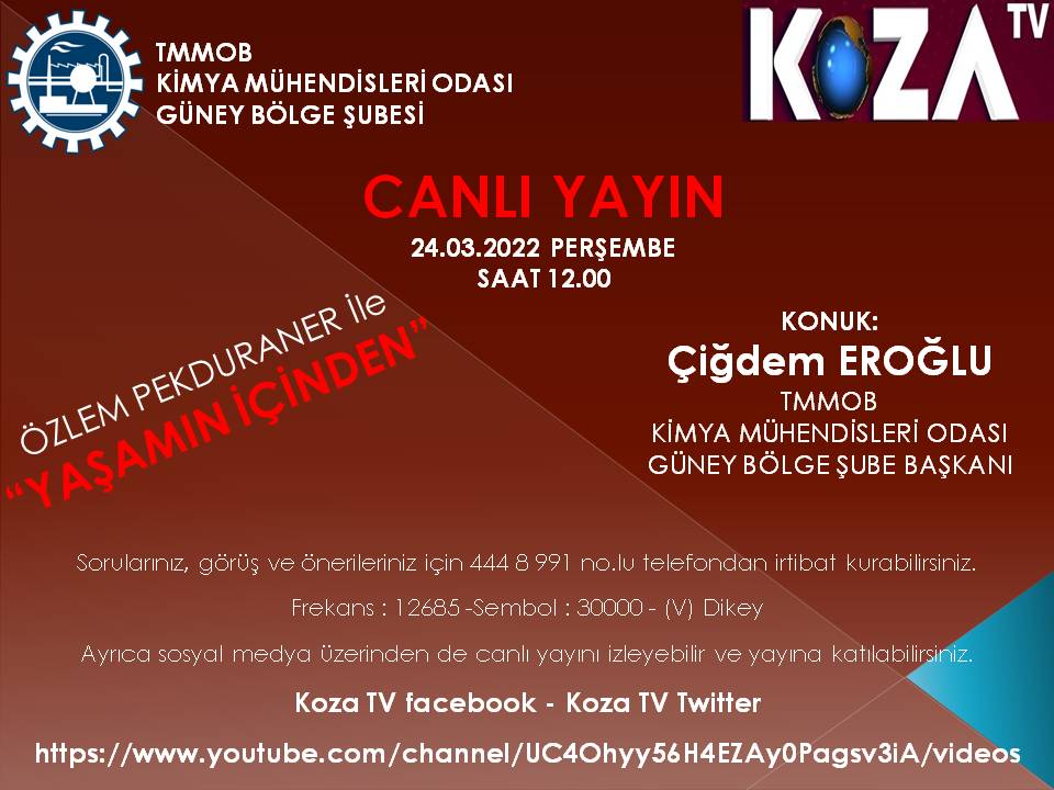 24 Mart Perşembe günü saat 12.00da Adana KOZA TVde hazırlanan "ÖZLEM PEKDURANER İLE YAŞAMIN İÇİNDEN" adlı programda Şube Başkanımız Çiğdem EROĞLU canlı yayın konuğu olacaktır. Görüş ve önerileriniz için 444 8 991 nolu telefondan irtibat kurabilirsiniz.