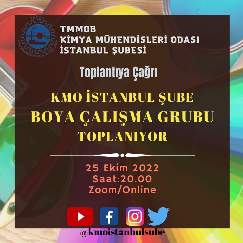 Sizleri 25 Ekim 2022 Salı günü, saat 20:00`da zoom programı üzerinden online gerçekleşecek olan Kimya Mühendisleri Odası İstanbul Şube Boya Çalışma Grubu`nda görev almaya, aktif katkı ve katılımda bulunmaya davet ediyoruz.
