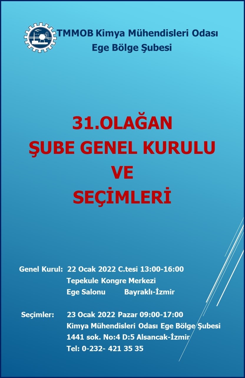 TMMOB Kimya Mühendisleri Odası Ege Bölge Şubesi 31. Olağan Genel Kurul Toplantısı, 22 Ocak 2022 tarihinde 13.00-16.00 saatleri arasında MMO Tepekule Kongre ve Sergi Merkezi Ege Salonu Bayraklı-İZMİR adresinde aynı gündem çerçevesinde, Seçimler 23 Ocak 2022 tarihinde 09.00-17.00 saatleri arasında 1441 Sk. No:4 K.3 D.5 Alsancak-İZMİR adresindeki şubemizde yapılacaktır.