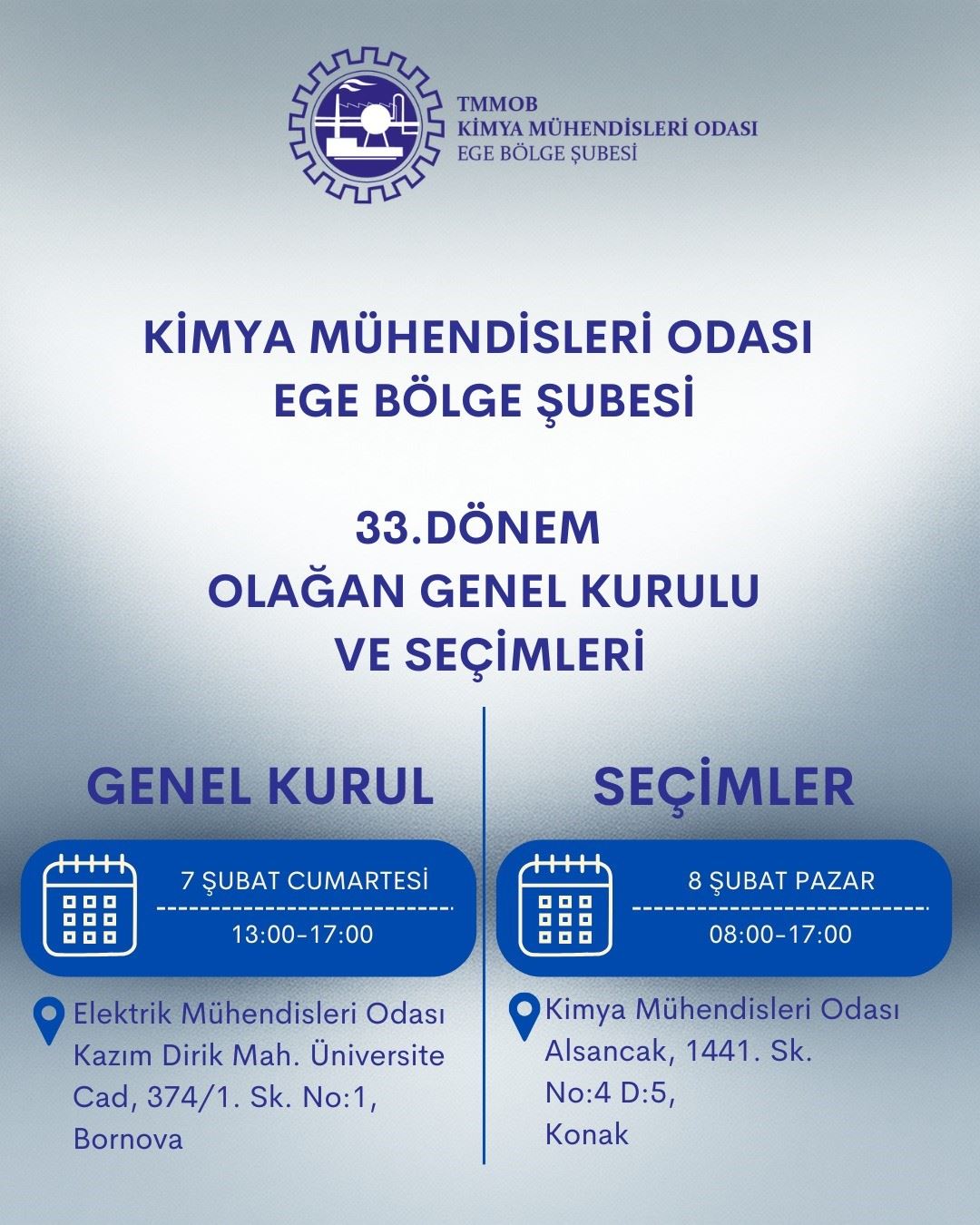 KMO Ege Bölge Şubesi olarak 33. Olağan Genel Kurul Toplantımız, 7 Şubat 2026 Cumartesi günü 13.00-16.00 saatleri arasında TMMOB Elektrik Mühendisleri Odası İzmir Şubesi Kazım Dirik Mah. Ünv. Cad. 374/1 Sk. No:1 Bornova-İZMİR adresinde, Seçimlerimiz ise 8 Şubat 2026 tarihinde 09.00-17.00 saatleri arasında 1441 Sk. No:4 D.5 (Kıbrıs Şehitleri Cad.) Alsancak-İZMİR adresindeki şubemizde yapılacaktır.