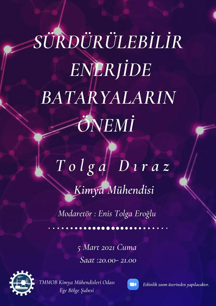 5 Mart Cuma Günü 20:00-21:00 tarihinde Tolga Dıraz katılımı ile "Sürdürülebilir Enerji"de "Bataryalar"ın Önemi söyleşi düzenlenecektir.