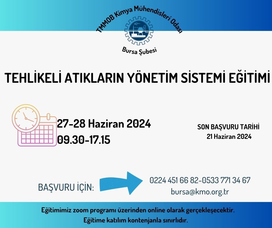 Odamız tarafından 27-28 Haziran 2024 tarihinde "TEHLİKELİ ATIKLARIN YÖNETİM SİSTEMİ EĞİTİMİ" zoom programı üzerinden online olarak düzenlenecektir. Eğitim ile ilgili detaylı bilgi aşağıda yer almakta olup eğitime katılmak isteyenlerin, ekte gönderilen başvuru formunu doldurup istenen belgeler ile birlikte 21 Haziran 2024 tarihine kadar bursa@kmo.org.tr adresine göndermelerini rica ederiz.