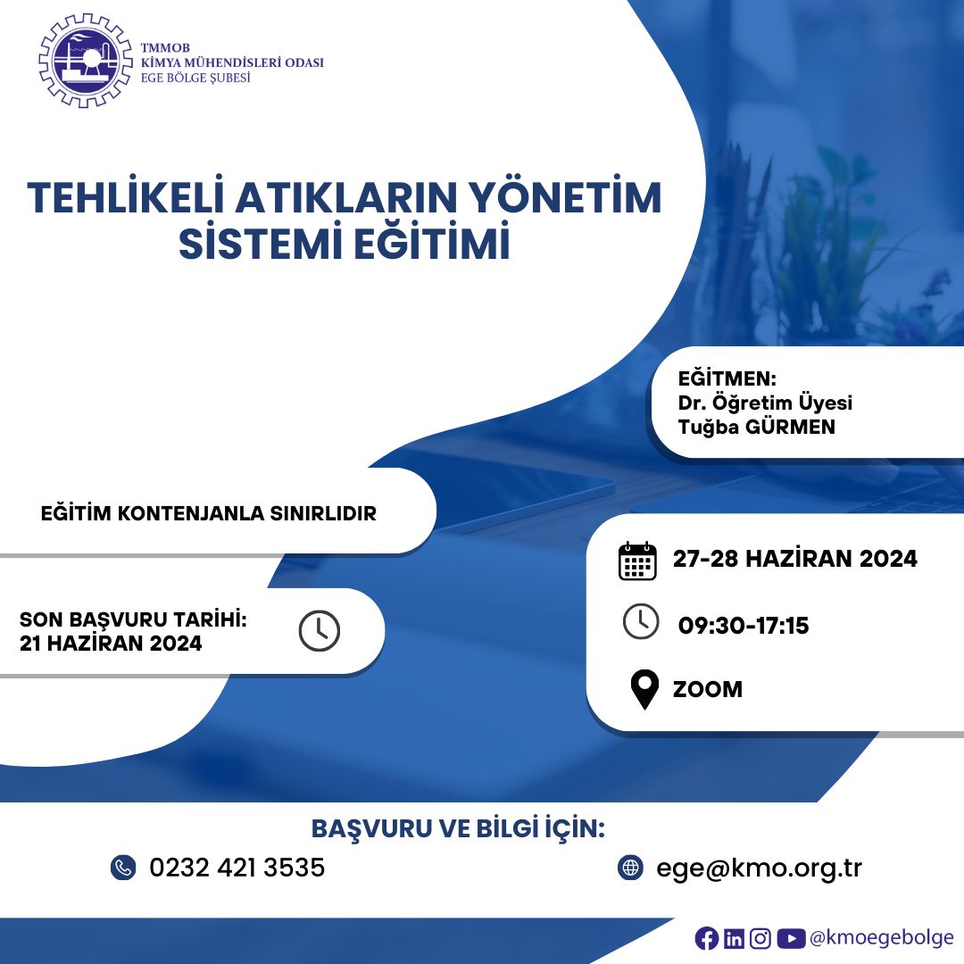 TMMOB Kimya Mühendisleri Odası tarafından 27-28 Haziran 2024 tarihinde "TEHLİKELİ ATIKLARIN YÖNETİM SİSTEMİ EĞİTİMİ" zoom programı üzerinden online olarak düzenlenecektir. Eğitim ile ilgili detaylı bilgi aşağıda yer almakta olup eğitime katılmak isteyenlerin, ekte gönderilen başvuru formunu doldurup istenen belgeler ile birlikte 21 Haziran 2024 tarihine kadar ege@kmo.org.tr adresine göndermelerini rica ederiz.