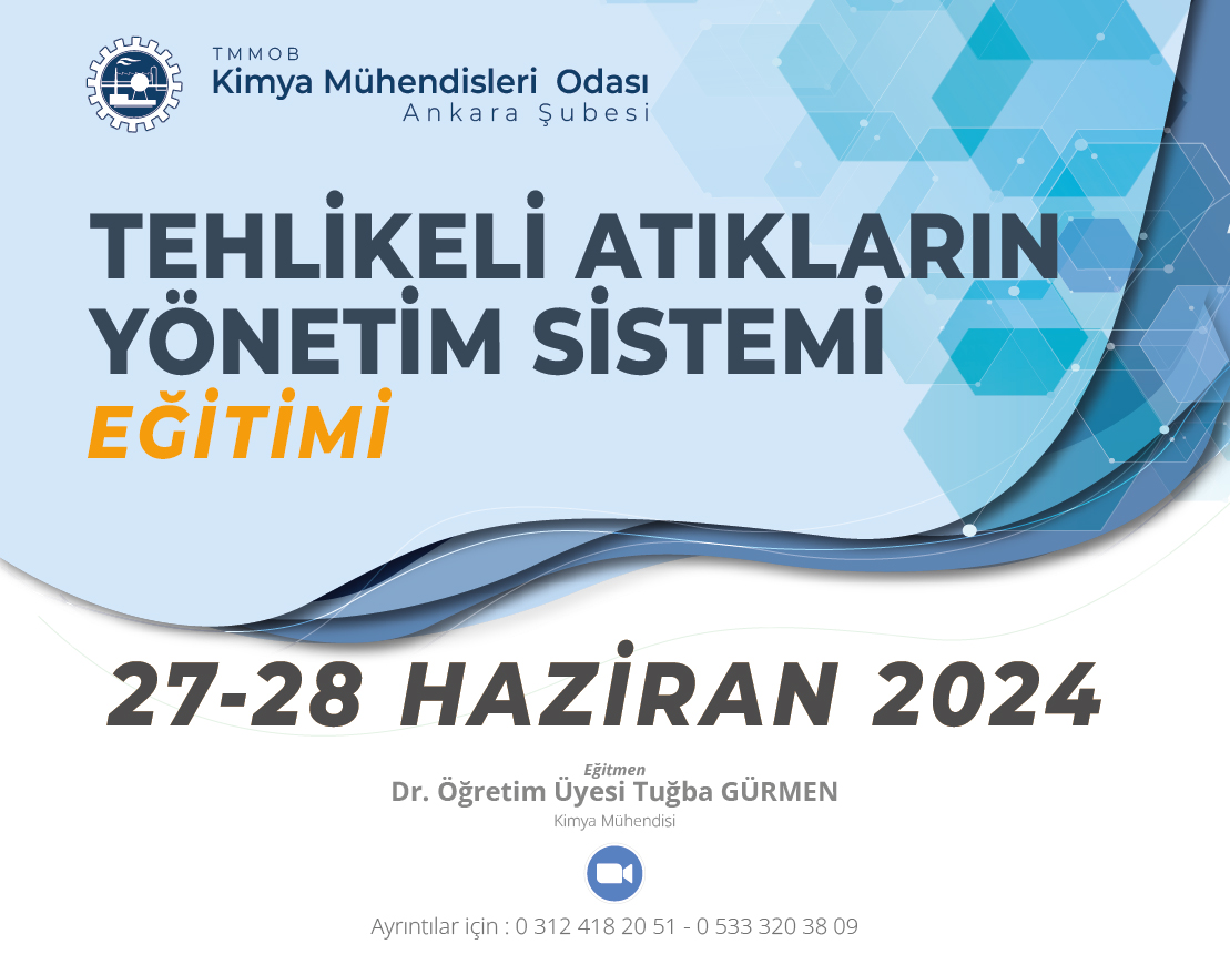 TMMOB Kimya Mühendisleri Odası tarafından 27-28 Haziran 2024 tarihinde `TEHLİKELİ ATIKLARIN YÖNETİM SİSTEMİ EĞİTİMİ` zoom programı üzerinden online olarak düzenlenecektir. Eğitim ile ilgili detaylı bilgi aşağıda yer almakta olup eğitime katılmak isteyenlerin, ekte gönderilen başvuru formunu doldurup istenen belgeler ile birlikte 21 Haziran 2024 tarihine kadar ankara@kmo.org.tr adresine göndermelerini rica ederiz.
