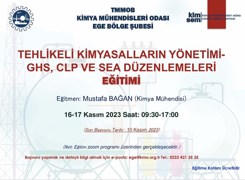 TMMOB Kimya Mühendisleri Odası Ege Bölge Şubesi tarafından 16-17 Kasım 2023 "TEHLİKELİ KİMYASALLARIN YÖNETİMİ- GHS, CLP VE SEA DÜZENLEMELERİ EĞİTİMİ" online olarak zoom uygulaması üzerinden düzenlenecektir.