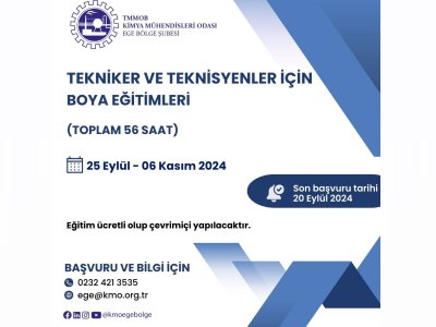 TMMOB Kimya Mühendisleri Odası Ege Bölge Şubesi olarak, 25 Eylül - 06 Kasım 2024 tarihleri arasında "Tekniker ve Teknisyenler İçin Boya Eğitimleri" zoom programı üzerinden online olarak düzenlenecektir. Eğitim ile ilgili detaylı bilgi aşağıda yer almakta olup eğitime katılmak isteyenlerin, ekte gönderilen başvuru formunu doldurup istenen belgeler ile birlikte 20 Eylül 2024 tarihine kadar gabtm@kmo.org.tr adresine göndermelerini rica ederiz.