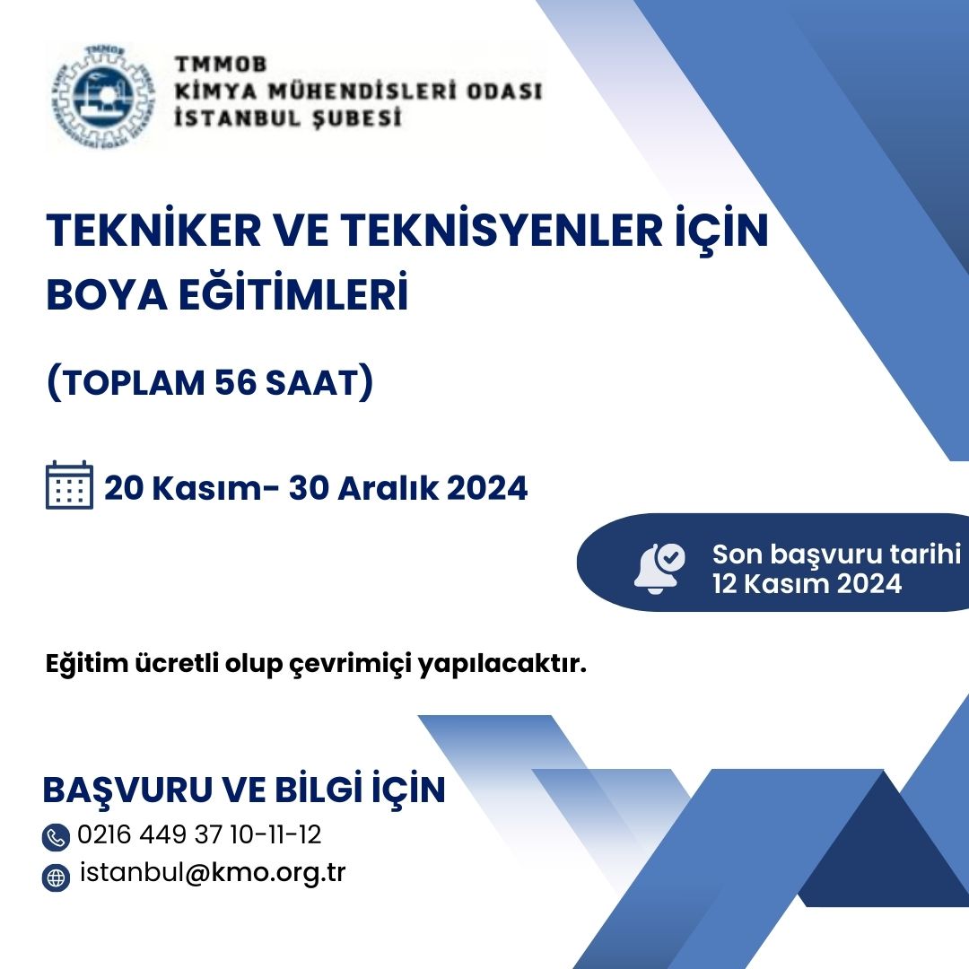 Odamız tarafından, 20 Kasım-30 Aralık 2024 tarihleri arasında `Tekniker ve Teknisyenler İçin Boya Eğitimleri` Zoom programı üzerinden online olarak düzenlenecektir.