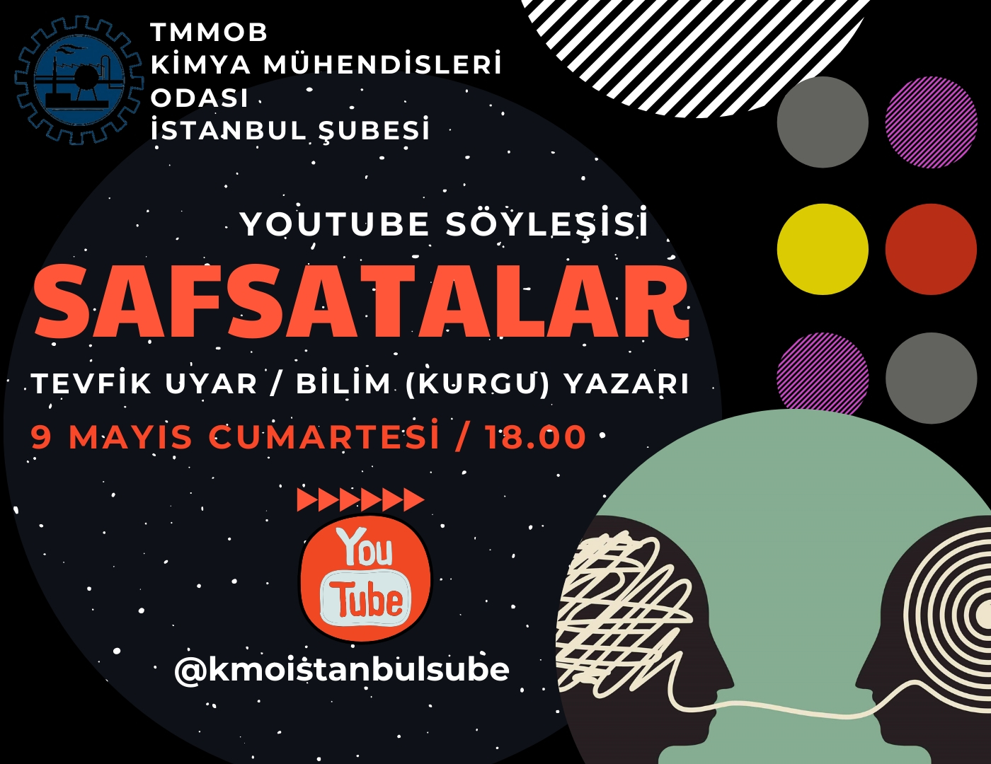 9 Mayıs Cumartesi saat 18:00da eleştirel düşünme alanındaki popüler bilim faaliyetleriyle tanınan Tevfik Uyar ile kitabı "Safsatalar" ile ilgili YouTube kanalımız üzerinden söyleşi gerçekleştireceğiz. www.youtube.com/kmoistanbulsube linkine girip kanala abone olduktan sonra bildirimleri açmanız halinde söyleşi başladığında size bildirim gelecektir.