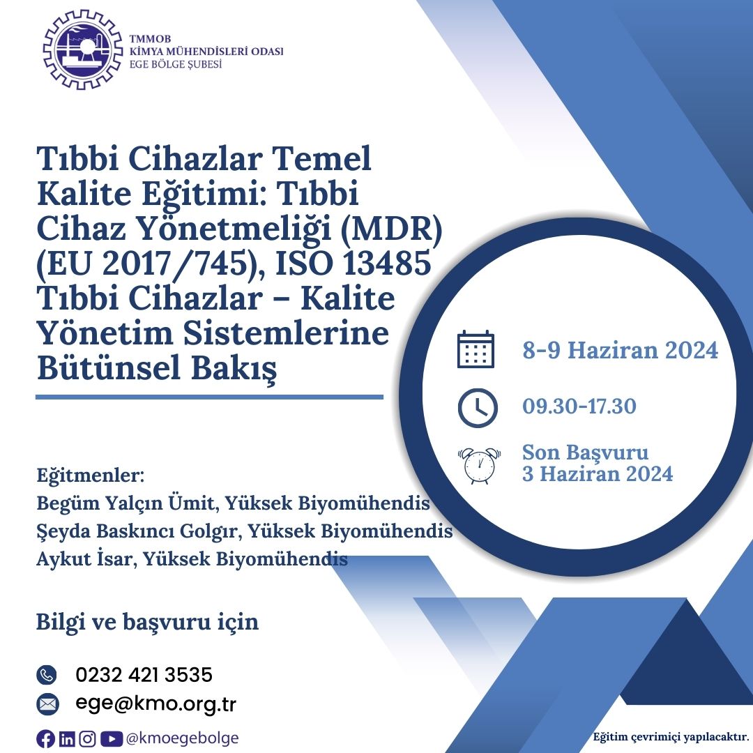 TMMOB Kimya Mühendisleri Odası tarafından 08-09 Haziran 2024 tarihlerinde "Tıbbi Cihazlar Temel Kalite Eğitimi: Tıbbi Cihaz Yönetmeliği (MDR) (EU 2017/745), ISO 13485 Tıbbi cihazlar - Kalite Yönetim Sistemlerine Bütünsel Bakış" zoom programı üzerinden online olarak düzenlenecektir. Eğitim ile ilgili detaylı bilgi aşağıda yer almakta olup eğitime katılmak isteyenlerin, ekte gönderilen başvuru formunu doldurup istenen belgeler ile birlikte 03 Haziran 2024 tarihine kadar ege@kmo.org.tr adresine göndermelerini rica ederiz.