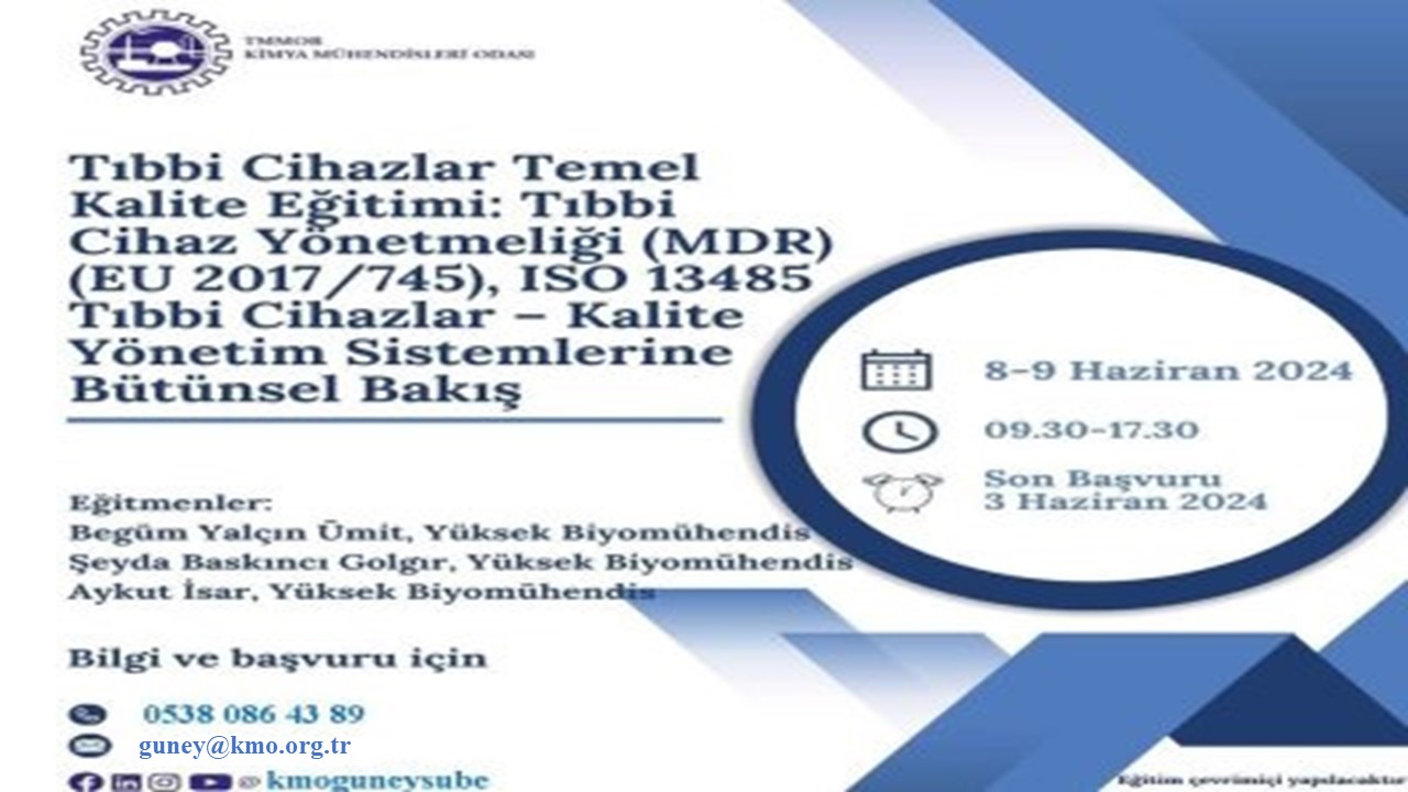 TMMOB Kimya Mühendisleri Odası tarafından 08-09 Haziran 2024 tarihlerinde "Tıbbi Cihazlar Temel Kalite Eğitimi: Tıbbi Cihaz Yönetmeliği (MDR) (EU 2017/745), ISO 13485 Tıbbi cihazlar - Kalite Yönetim Sistemlerine Bütünsel Bakış" zoom programı üzerinden online olarak düzenlenecektir. Eğitim ile ilgili detaylı bilgi aşağıda yer almakta olup eğitime katılmak isteyenlerin, ekte gönderilen başvuru formunu doldurup istenen belgeler ile birlikte 03 Haziran 2024 tarihine kadar guney@kmo.org.tr adresine göndermelerini rica ederiz.
