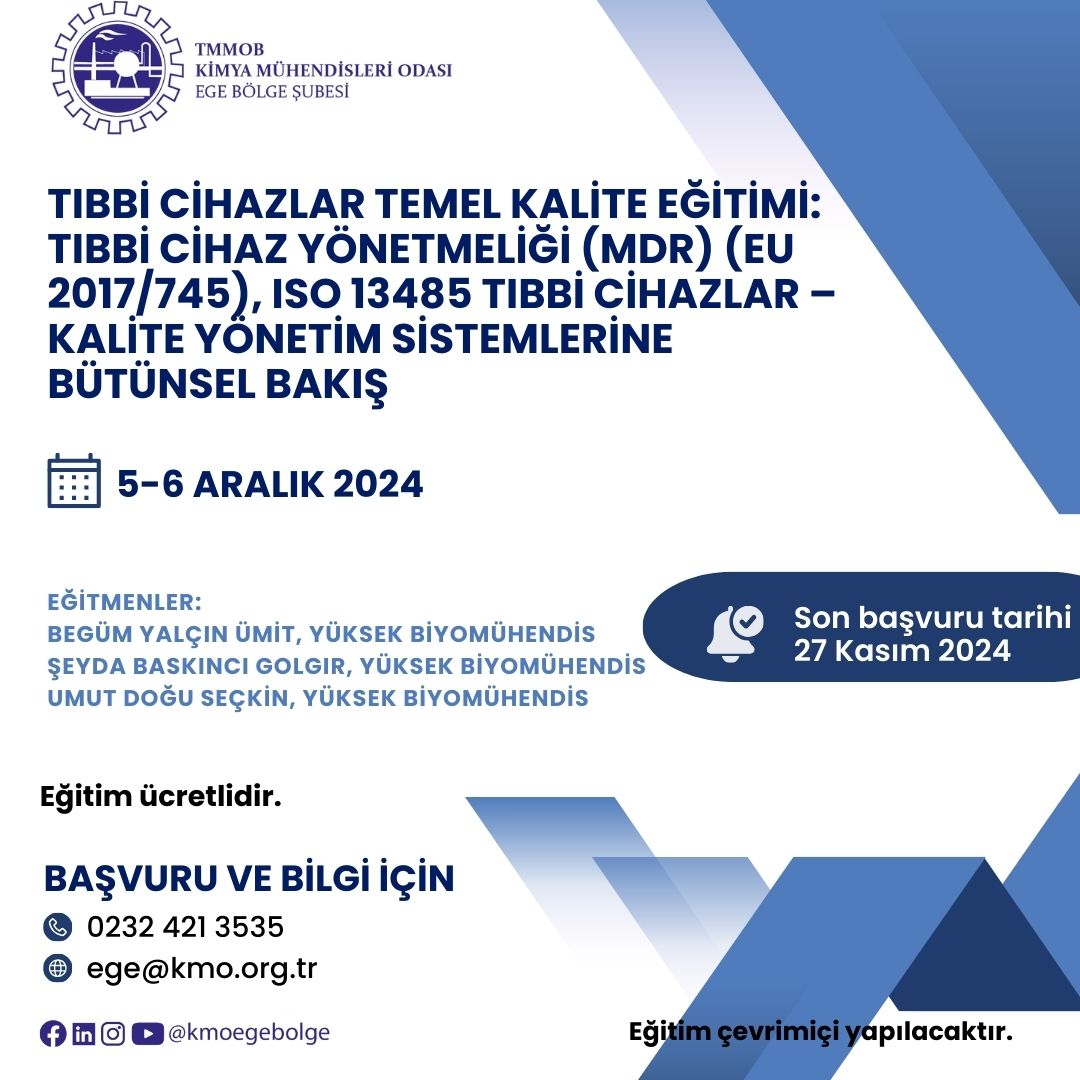 TMMOB Kimya Mühendisleri Odası tarafından 05-06 Aralık 2024 tarihlerinde "Tıbbi Cihazlar Temel Kalite Eğitimi: Tıbbi Cihaz Yönetmeliği (MDR) (EU 2017/745), ISO 13485 Tıbbi cihazlar – Kalite Yönetim Sistemlerine Bütünsel Bakış" zoom programı üzerinden online olarak düzenlenecektir. Eğitim ile ilgili detaylı bilgi aşağıda yer almakta olup eğitime katılmak isteyenlerin, ekte gönderilen başvuru formunu doldurup istenen belgeler ile birlikte 27 Kasım 2024 tarihine kadar ege@kmo.org.tr adresine göndermelerini rica ederiz.