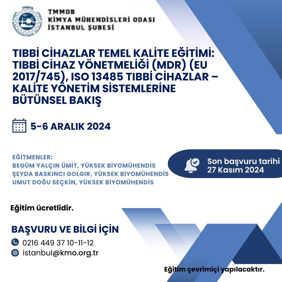 Odamız tarafından 05-06 Aralık 2024 tarihlerinde `Tıbbi Cihazlar Temel Kalite Eğitimi: Tıbbi Cihaz Yönetmeliği (MDR) (EU 2017/745), ISO 13485 Tıbbi cihazlar - Kalite Yönetim Sistemlerine Bütünsel Bakış` zoom programı üzerinden online olarak düzenlenecektir.