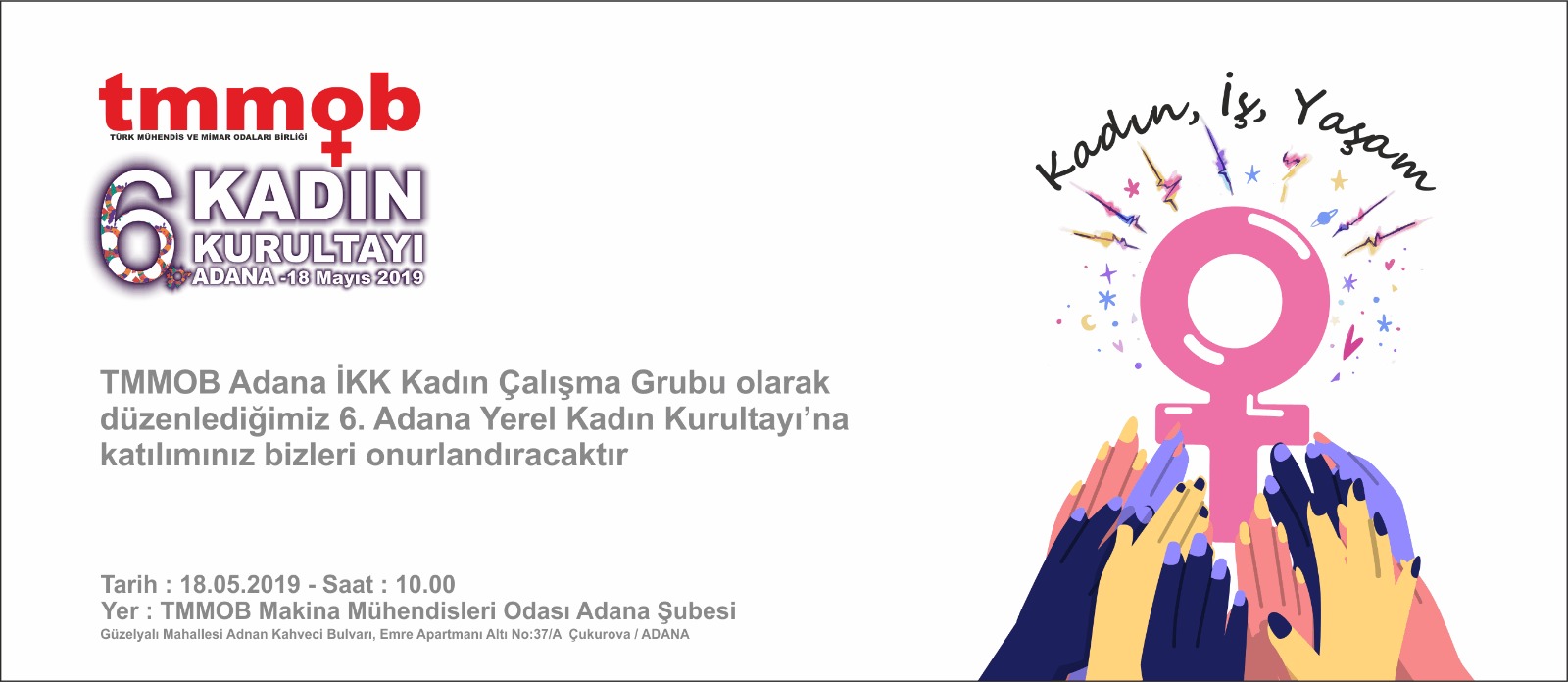 18 Mayıs 2019 saat 10.00da TMMOB Adana İl Koordinasyon Kurulu Kadın Çalışma Grubu tarafından Makina Mühendisleri Odası Adana Şubesinde düzenlenecek olan 6. Adana Yerel Kadın Kurultayına tüm üyelerimiz davetlidir.