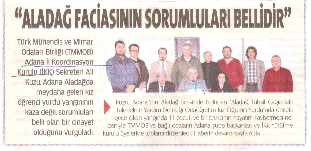 TMMOB ADANA İL KOORDİNASYON KURULU `ALADAĞ FACİASININ SORUMLULARI BELLİDİR.`