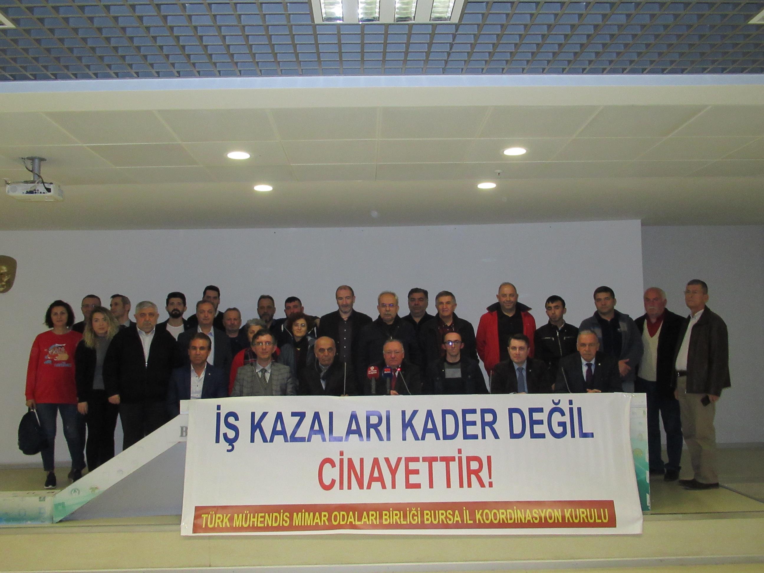 TMMOB Bursa İl Koordinasyon Kurulu tarafından TMMOB`nin ilan ettiği "3 Mart İş Cinayetlerine Karşı Mücadele Günü" nedeniyle 3 Mart 2020 tarihinde saat 12.30`da Bursa Akademik Odalar Birliği (BAOB) Yerleşkesi ortak salonunda basın açıklaması gerçekleştirildi.