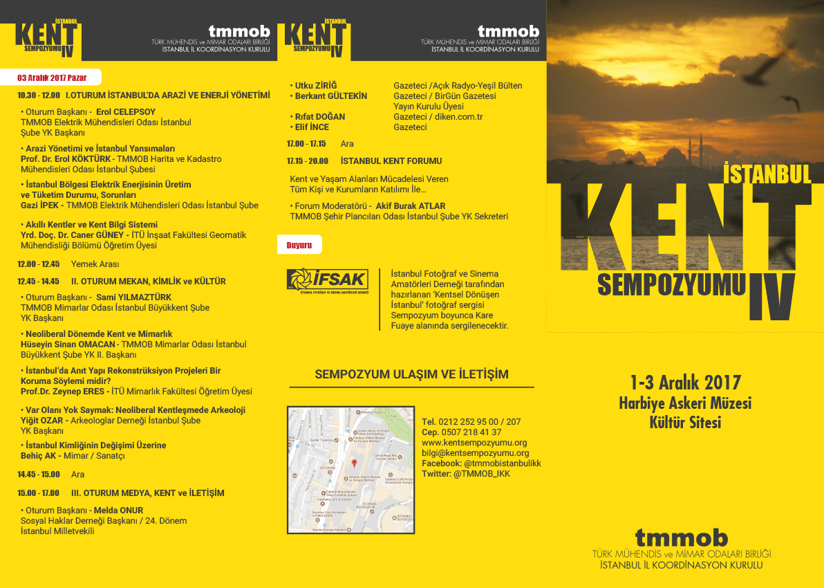 Şubemizin de bileşeni olduğu TMMOB İstanbul İl Koordinasyon Kurulu (İKK) tarafından yürütülmekte olan IV. İstanbul Kent Sempozyumu Sempozyumu 1-2-3 Aralık 2017 tarihlerinde Harbiye Askeri Müzesi'nde gerçekleşecektir.