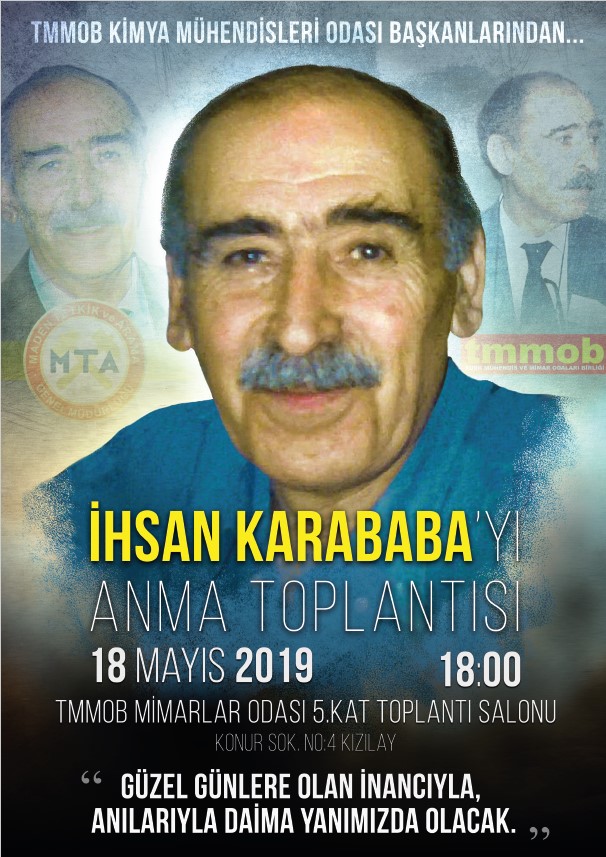 25 Mart 2019 tarihinde kaybettiğimiz TMMOB Kimya Mühendisleri Odası eski başkanı, değerli büyüğümüz İhsan KARABABA için şubemiz tarafından anma toplantısı düzenlenecektir. Toplantıya tüm sevenleri ve tüm meslektaşlarımız davetlidir.
