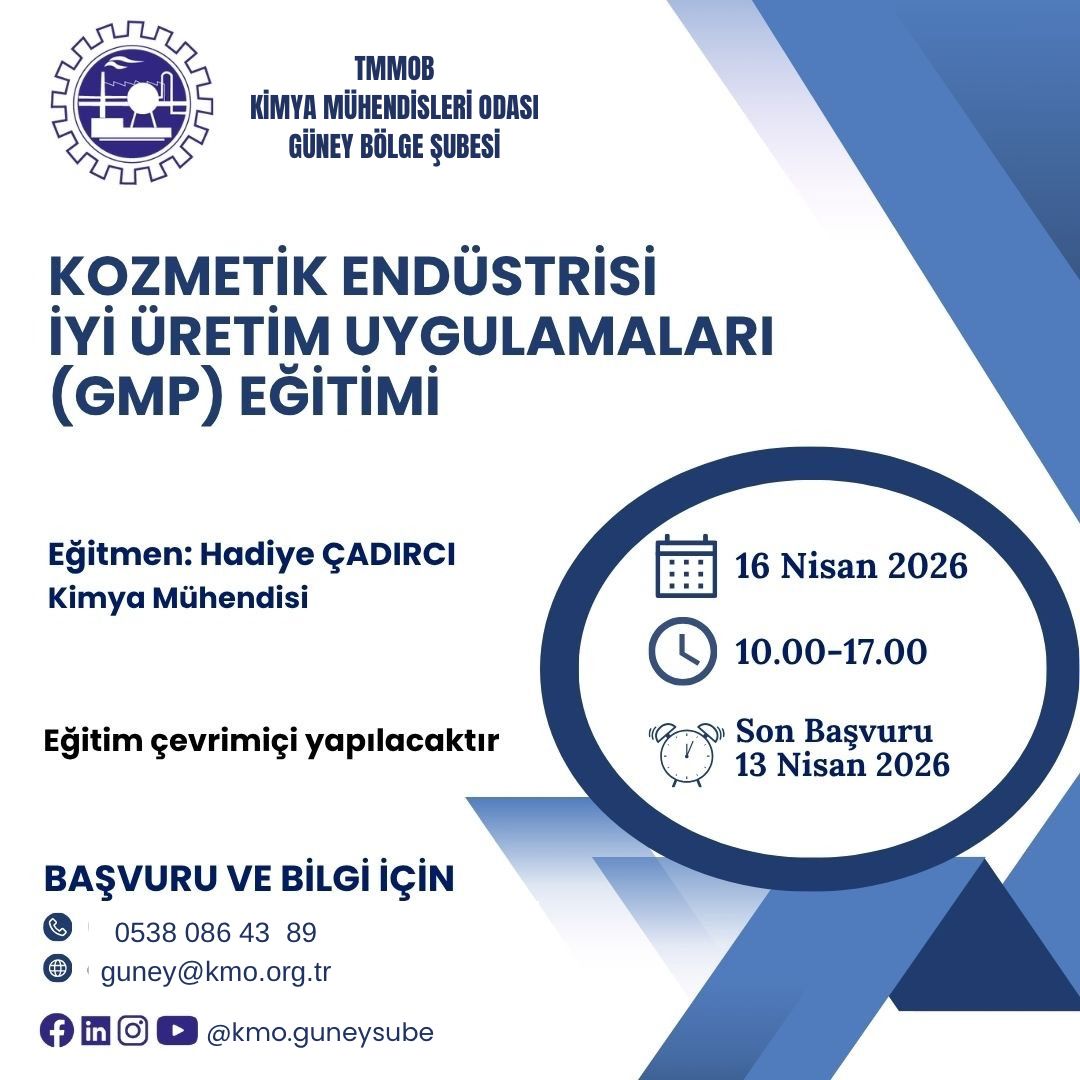 TMMOB Kimya Mühendisleri Odası tarafından 16 Nisan 2026 tarihinde “KOZMETİK ENDÜSTRİSİ İYİ ÜRETİM UYGULAMALARI EĞİTİMİ”