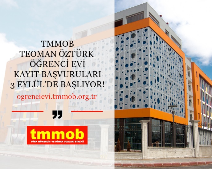 TMMOB Teoman Öztürk Öğrenci Evi ve Sosyal Tesisi 2018-2019 öğrenim dönemi için başvuru ve kayıtları 3 Eylül 2018 tarihinde başlayacak. 2 kişilik odalarda kahvaltı dahil kişi başı 1 aylık oda katkı payı 650 TL olan öğrenci evi için başvurular web sayfası üzerinden yapılacaktır.