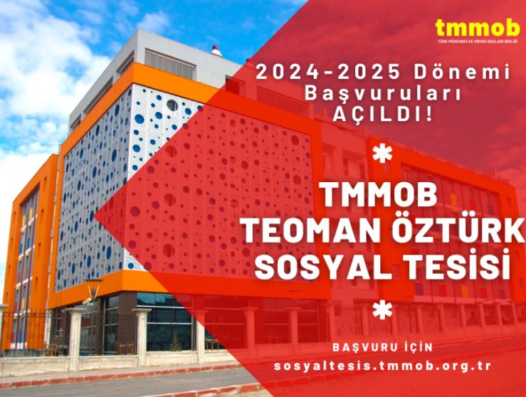 TMMOB Teoman Öztürk Sosyal Tesisi 2024-2025 dönemi için başvuru ve kayıtlar başladı. 2 kişilik odalarda kahvaltı dahil kişi başı 1 aylık oda katkı payı 9500 TL olan Sosyal Tesis için başvurular web sayfası üzerinden yapılmaktadır.