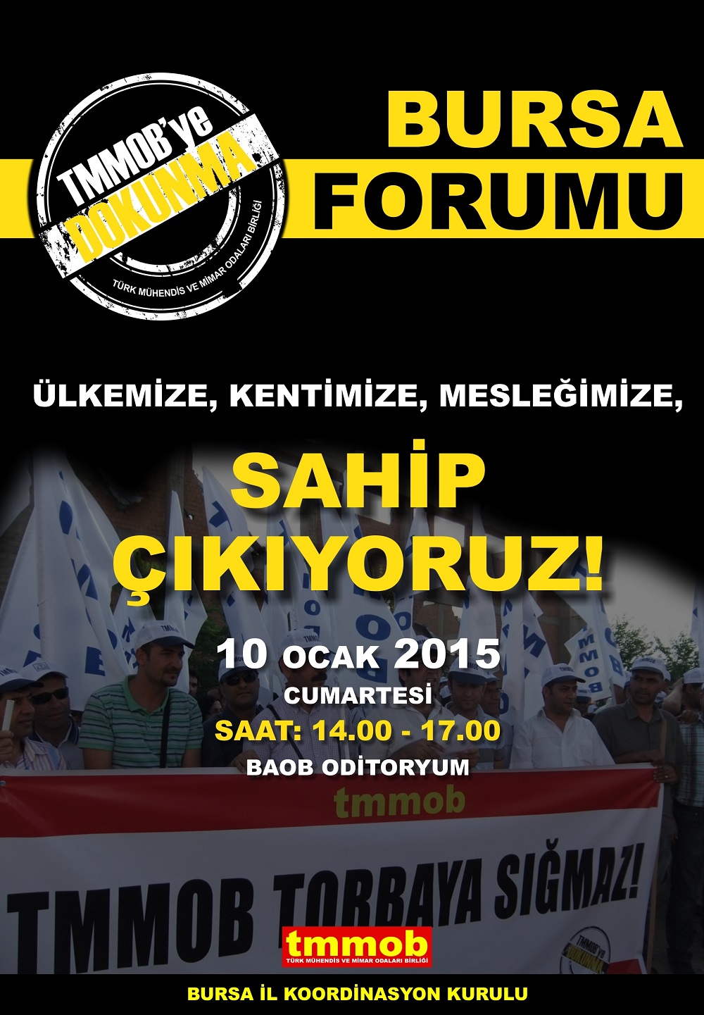 10 Ocak 2015 Cumartesi günü saat 14.00 da BAOB Oditoryum salonunda TMMOB yasasında değişikliği de içeren torba yasaya karşı ülkemize, kentimize, mesleğimize sahip çıkmak adına TMMOB`ye DOKUNMA BURSA FORUMU yapılacaktır.
