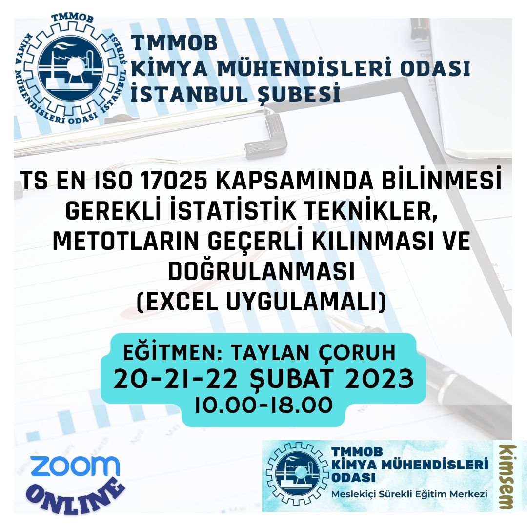 Şubemiz tarafından 20-21-22 Şubat 2023 tarihlerinde saat 10.00-18.00 saatleri arasında `TS EN ISO 17025 Kapsamında Bilinmesi Gerekli İstatistik Teknikler, Metotların Geçerli Kılınması ve Doğrulanması Eğitimi (Excel Uygulamalı)` zoom programı üzerinden online olarak düzenlenecektir.