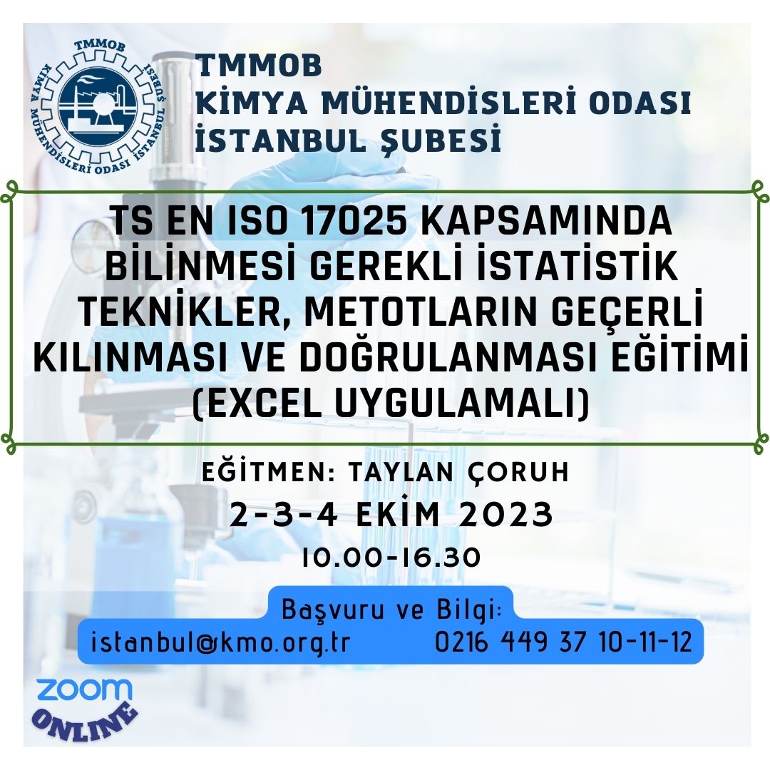 Şubemiz tarafından 2-3-4 Ekim 2023 tarihlerinde saat 10.00-16.30 saatleri arasında `TS EN ISO 17025 Kapsamında Bilinmesi Gerekli İstatistik Teknikler, Metotların Geçerli Kılınması ve Doğrulanması Eğitimi (Excel Uygulamalı)` zoom programı üzerinden online olarak düzenlenecektir.