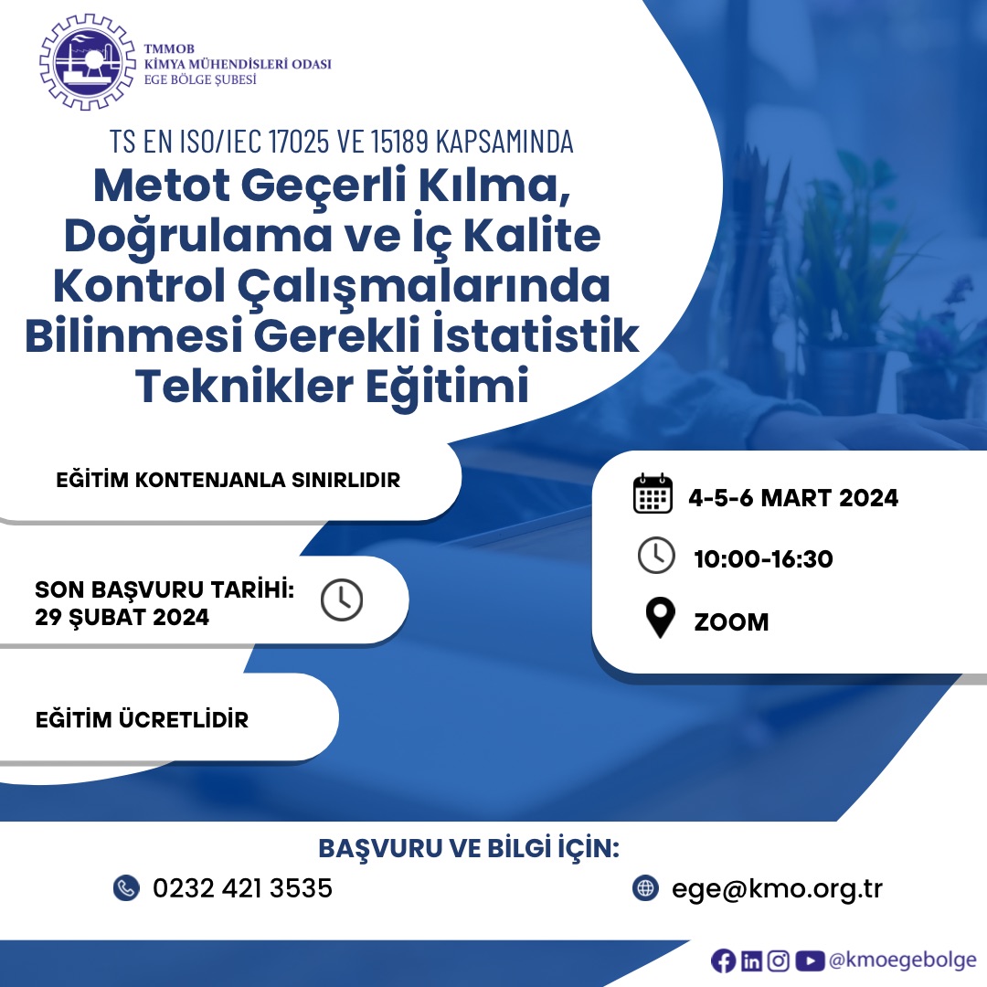 Odamız tarafından 4-5-6 Mart 2024 tarihlerinde saat 10.00-16.30 saatleri arasında "TS EN ISO 17025 ve 15189 Kapsamında, Metot Geçerli Kılma, Doğrulama ve İç Kalite Kontrol Çalışmaarında Bilinmesi Gerekli İstatistik Teknikler Eğitimi (Excel Uygulamalı)" zoom programı üzerinden online olarak düzenlenecektir. Eğitim ile ilgili detaylı bilgi aşağıda olup eğitime katılmak isteyenlerin, ekteki/dosyalar kısmındaki başvuru formunu doldurup istenen belgeler ile birlikte 29 Şubat 2024 tarihine kadar, ege@kmo.org.tr adresine göndermelerini rica ederiz.