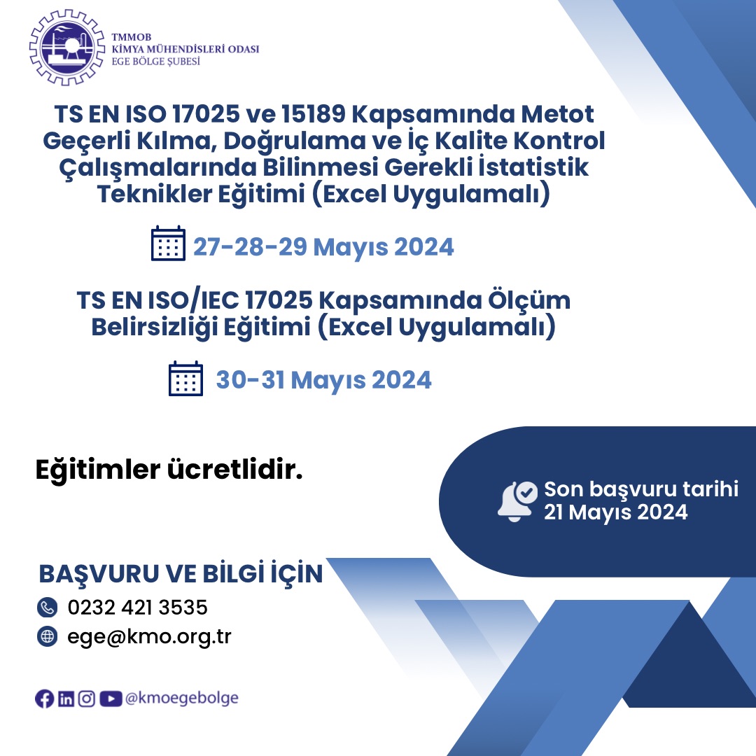 27-28-29 Mayıs 2024 tarihlerinde, 10.00-16.30 saatleri arasında "TS EN ISO 17025 ve 15189 Kapsamında Metot Geçerli Kılma, Doğrulama ve İç Kalite Kontrol Çalışmalarında Bilinmesi Gerekli İstatistik Teknikler Eğitimi (Excel Uygulamalı)"
