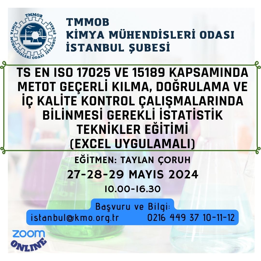 Şubemiz tarafından 27-28-29 Mayıs 2024 tarihlerinde saat 10.00-16.30 saatleri arasında "TS EN ISO 17025 ve 15189 Kapsamında Metot Geçerli Kılma, Doğrulama ve İç Kalite Kontrol Çalışmalarında Bilinmesi Gerekli İstatistik Teknikler Eğitimi (Excel Uygulamalı)" zoom programı üzerinden online olarak düzenlenecektir. Eğitim ile ilgili detaylı bilgi aşağıda olup eğitime katılmak isteyenlerin, ekteki/dosyalar kısmındaki başvuru formunu doldurup istenen belgeler ile birlikte 21 Mayıs 2024 tarihine kadar, istanbul@kmo.org.tr adresine göndermelerini rica ederiz.