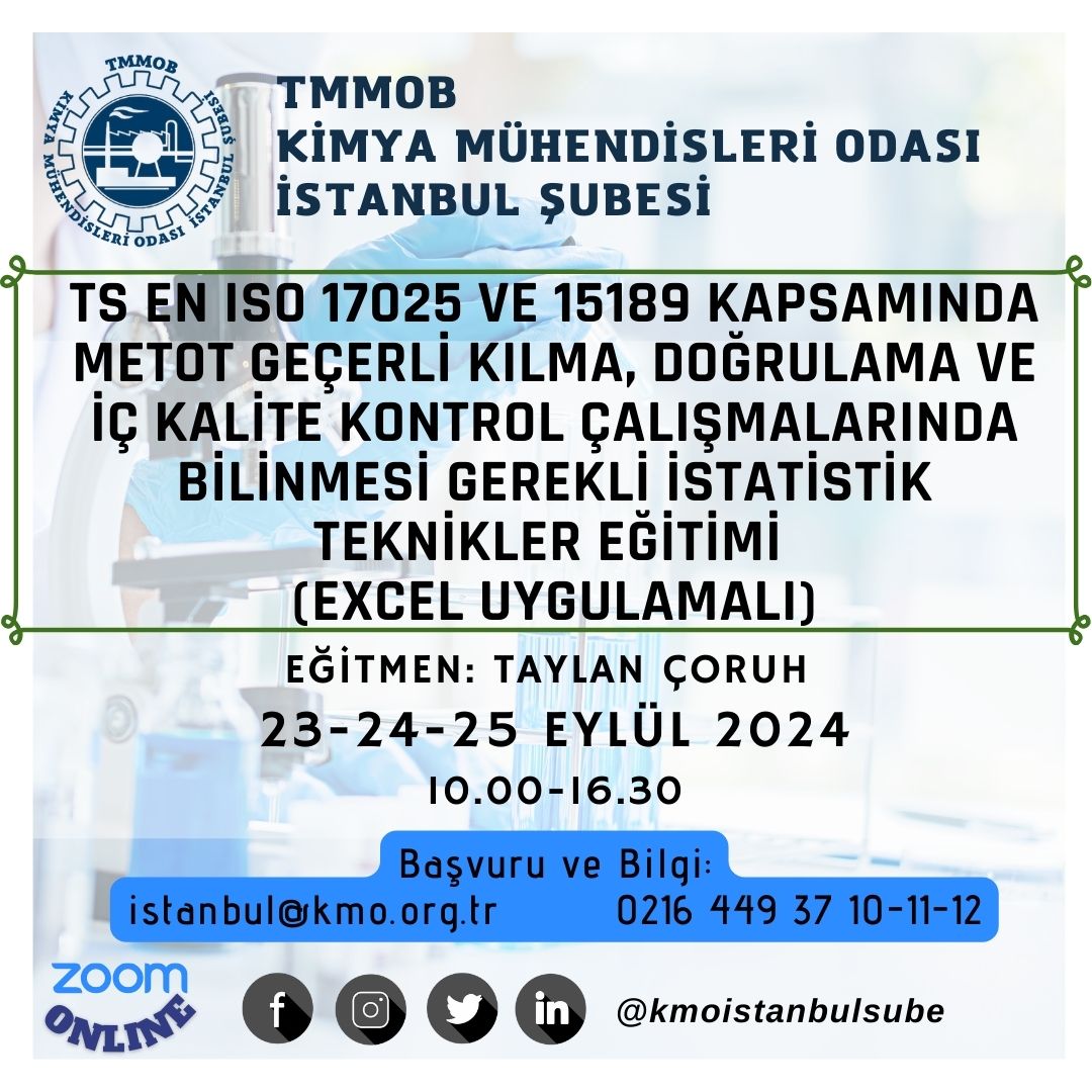 Şubemiz tarafından 23-24-25 Eylül 2024 tarihlerinde saat 10.00-16.30 saatleri arasında "TS EN ISO 17025 ve 15189 Kapsamında Metot Geçerli Kılma, Doğrulama ve İç Kalite Kontrol Çalışmalarında Bilinmesi Gerekli İstatistik Teknikler Eğitimi (Excel Uygulamalı)" zoom programı üzerinden online olarak düzenlenecektir. Eğitim ile ilgili detaylı bilgi aşağıda olup eğitime katılmak isteyenlerin, ekteki/dosyalar kısmındaki başvuru formunu doldurup istenen belgeler ile birlikte 19 Eylül 2024 tarihine kadar, istanbul@kmo.org.tr adresine göndermelerini rica ederiz.